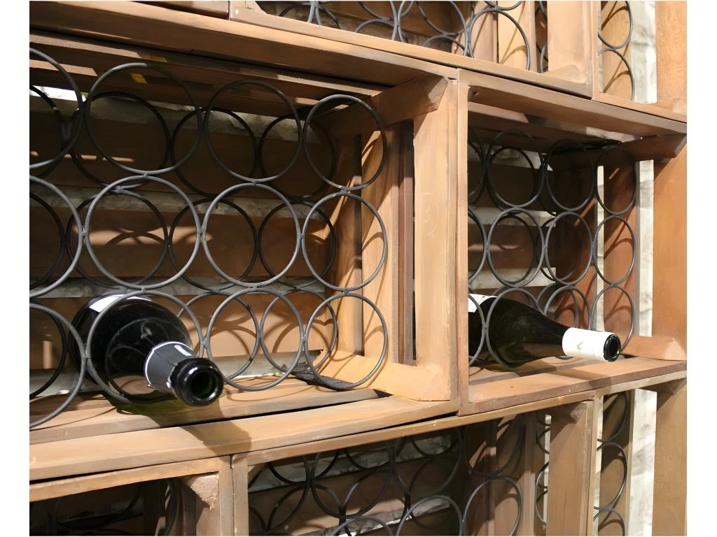 Un casier à bouteille « comme autrefois », en bois et métal, pour ranger les bouteilles avec style et élégance.