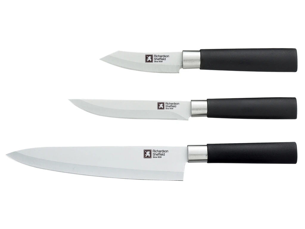 Set de 3 couteaux de cuisine Aïkido par Richardson Sheffield. Ce set se compose d’un couteau chef, d’un couteau office et d’un couteau utile. Lame en acier inox 13/0, finition satiné et manche polypro.