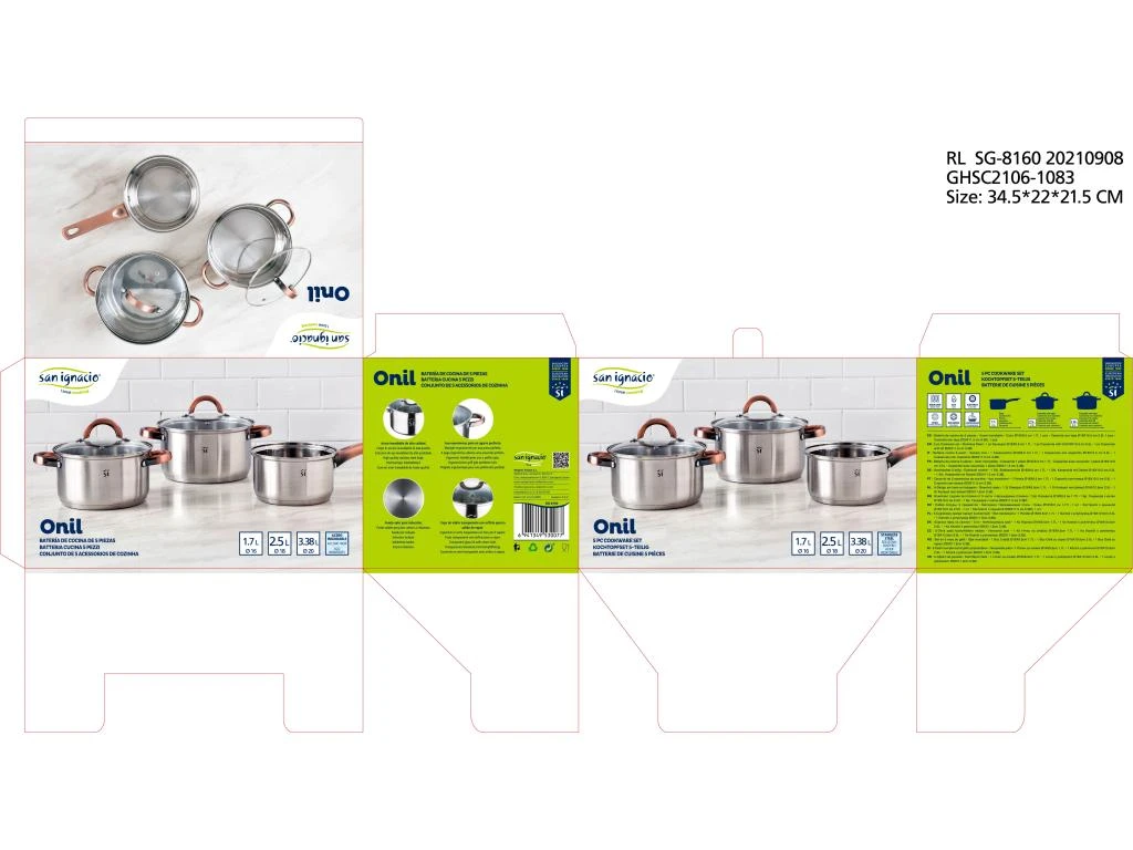 Great San Ignacio Kitchen Battery, dans sa collection Onil, 5 pièces: 2 pots avec ses tapas en verre et une casserole.