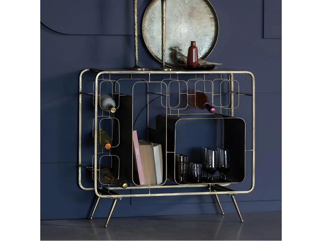 Le casier à bouteilles Capo se présente comme une structure métallique à la finition laiton doré brillant d’une hauteur de 80,5 cm pour 87 cm de long et seulement 33 cm de profondeur. Autant dire qu’il pourra se poser partout, du salon à la salle à manger. Côté style, ce meuble assume une influence Art Déco, à la fois vintage et profondément chic : à accessoiriser avec les shakers typiques des années 30 !