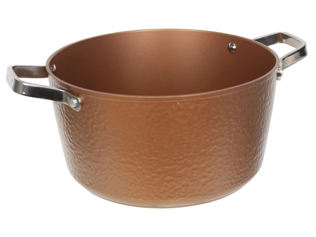 Ø28×15 cm Sucrepan, d’aluminium forgé en couleur cuivre intérieure et extérieure avec une fin martelée, qui attribue une apparence asymétrique et contribue à sa personnalité, de la collection d’origine San Ignacio. 6,9 litres de capacité.