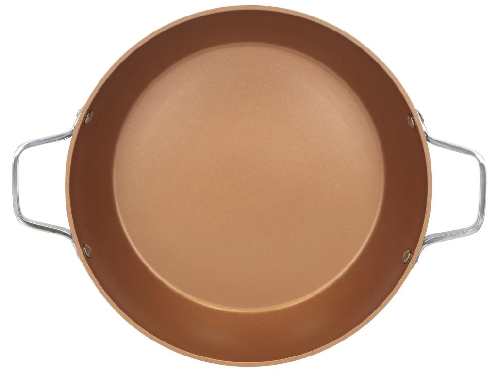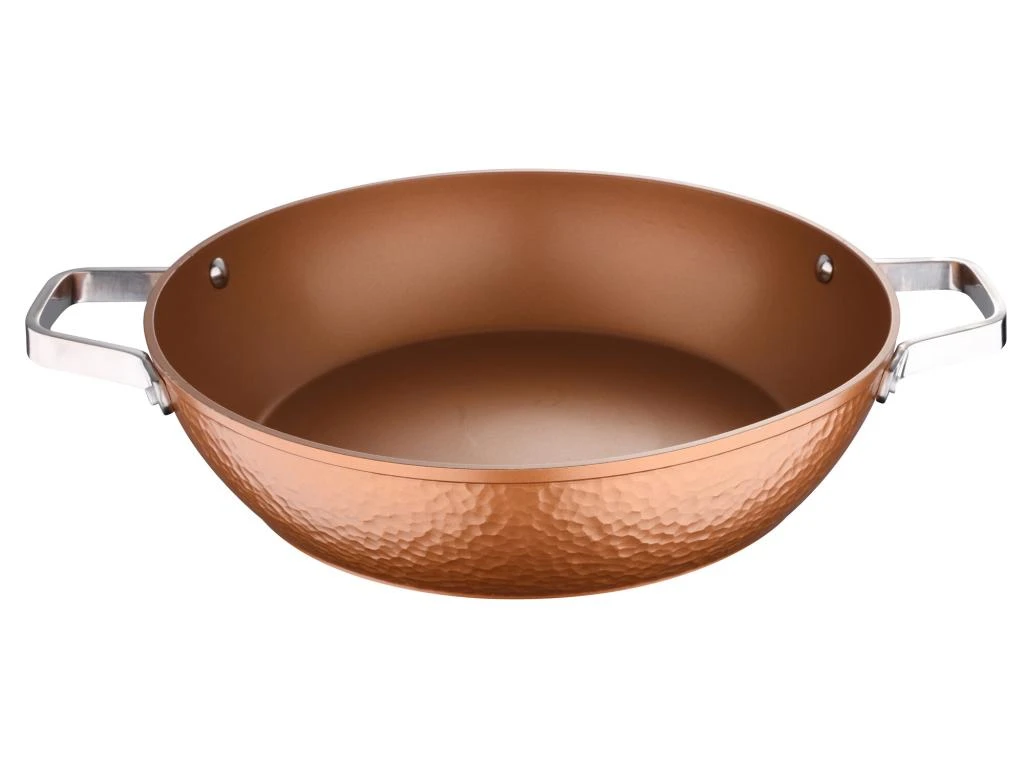 Sucrepan faible, idéal pour les ragoûts, de Ø32×7,8 cm, d’aluminium forgé dans une couleur de cuivre intérieure et extérieure avec une fin martelée, qui attribue une apparence asymétrique et contribue à sa personnalité, de la collection d’origine de San ignacio. 5,3 litres de capacité.