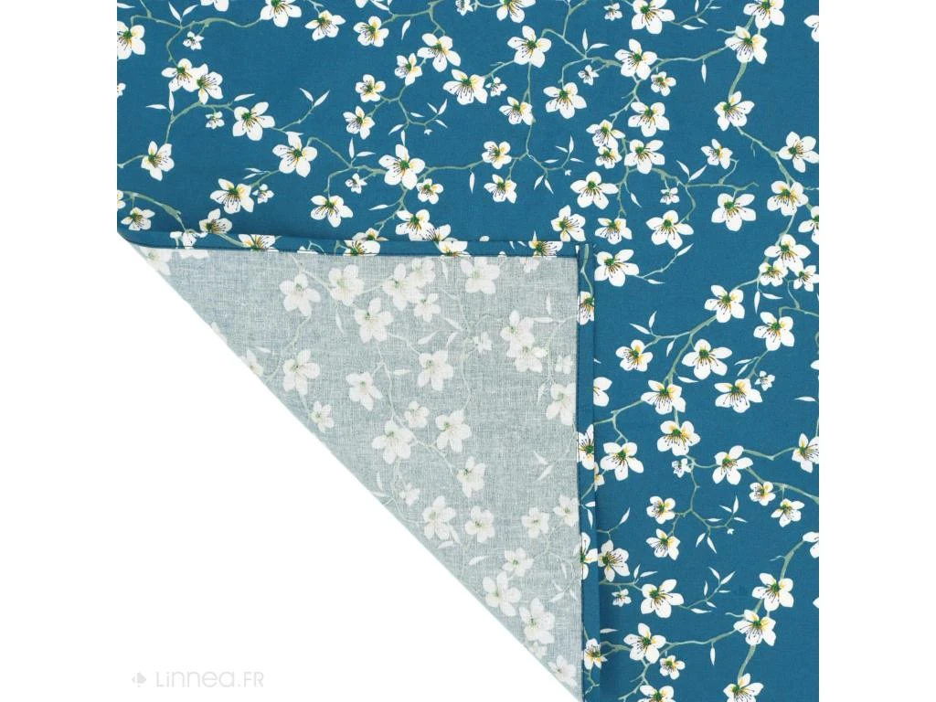 CHEMIN DE TABLE AMANDIER chic et élégant en toile cretonne lourde enduite avec une parfaite finition qui vous garantie une excellente qualité et tenue dans le temps. Un CHEMIN DE TABLE intemporel qui habillera votre table avec un air d’été, avec un motif de petites fleurs d’amandier sur branches et feuillages discrets sur fond bleu Bleu.