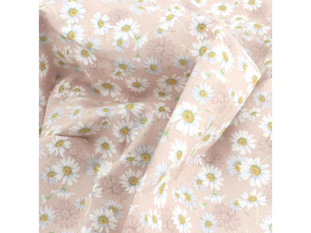 CHEMIN DE TABLE ASTER chic et élégant en toile cretonne lourde enduite avec une parfaite finition qui vous garantie une excellente qualité et tenue dans le temps. Un CHEMIN DE TABLE intemporel qui habillera votre table avec un motif de petites fleurs de paquerettes avec effet de prodondeur sur fond Rose poudré.