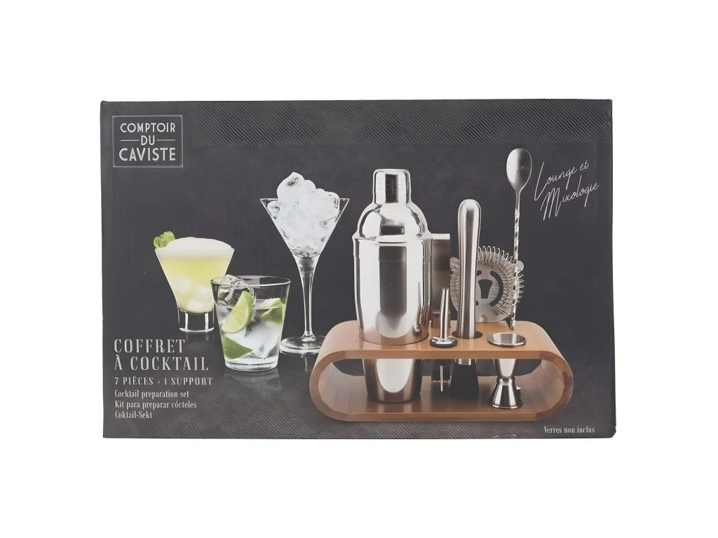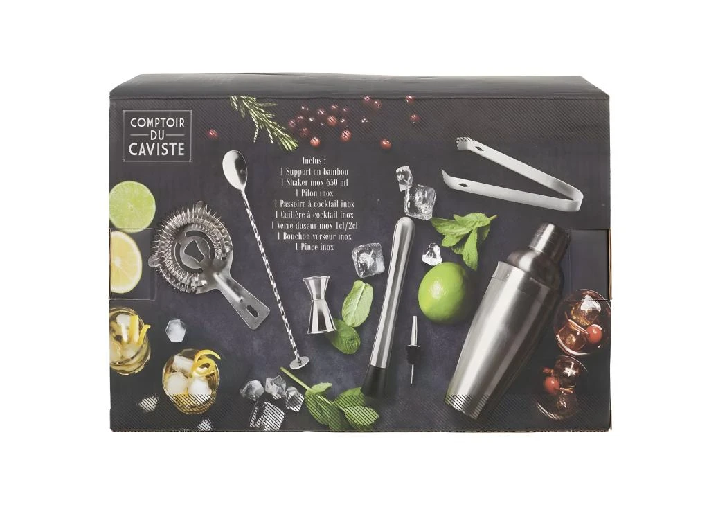 Composition : 1 support en bambou , 1 shaker inox 650 ml , 1 pilon inox , 1 passoire à cocktail inox , 1 cuillère à cocktail inox , 1 verre doseur inox 1 cl 2cl , 1 bouchon verseur inox , 1 pince inox