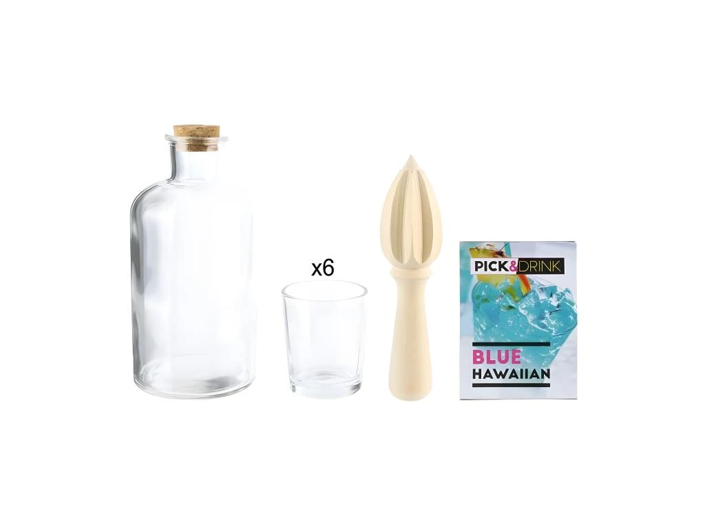 Composition : 1 presse-agrumes 1 livre de recettes Décor pirates 1 bouteille en verre avec bouchon en liège de 53 cl 6 verres de 7 cl