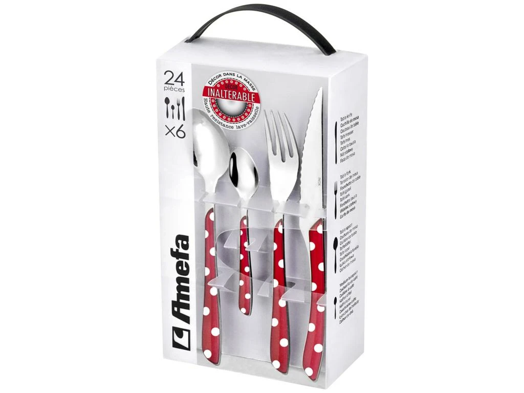 Moderne et acidulée, la gamme Eclat Pois réveille vos tables. Les manches en bi-injection allient les couleurs pétillantes à des effets de transparence.