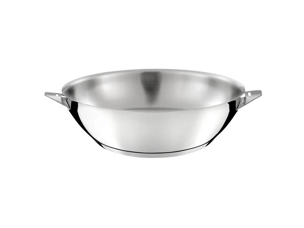 Wok en inox de diamètre 28cm. Inox finition miroir et fond encapsulĂ© de 6mm d’Ă©paisseur pour une parfaite rĂ©partition de la chaleur, sur tous types de feux. QualitĂ© professionnelle et ligne Ă©lĂ©gante.