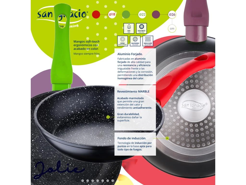 L’ensemble de poêles à frire Jolie est fabriqué en aluminium forgé de haute qualité offrant une résistance unique à la corrosion et à l’usure des pièces. L’intérieur est doté d’un revêtement marbré avec de petites mouchetures colorées qui favorise une cuisson parfaite des aliments, évite que les aliments ne collent au fond et facilite également le nettoyage. La base intègre un socle à induction qui permet une distribution rapide et optimale de la chaleur dans toute la pièce. Cette base est compatible avec toutes les cuisinières du marché, y compris les cuisinières à induction. La poignée de chaque pièce a une finition de couleur différente et intègre la technologie « soft touch », offrant une prise en main agréable, confortable et sûre.