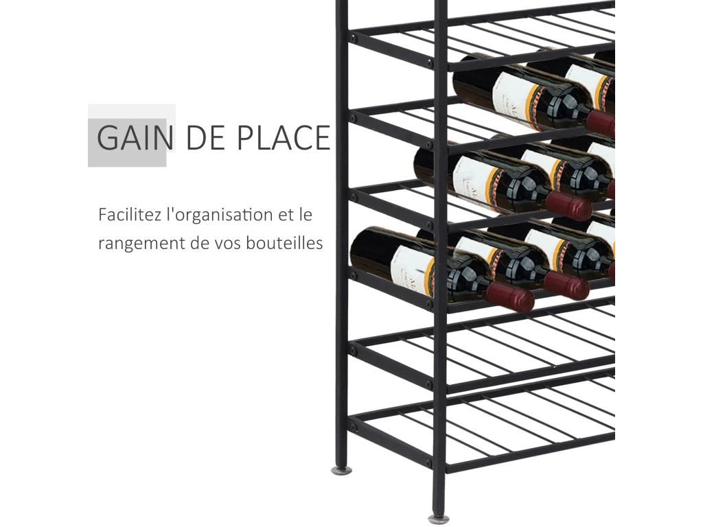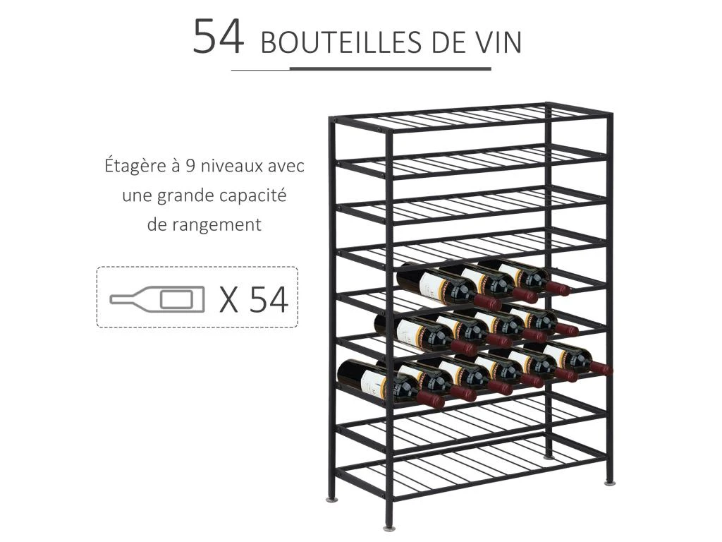 – Grande capacité de stockage sur 9 niveaux, 6 bouteilles maximum par niveau soit capacité totale de 54 bouteilles stockées