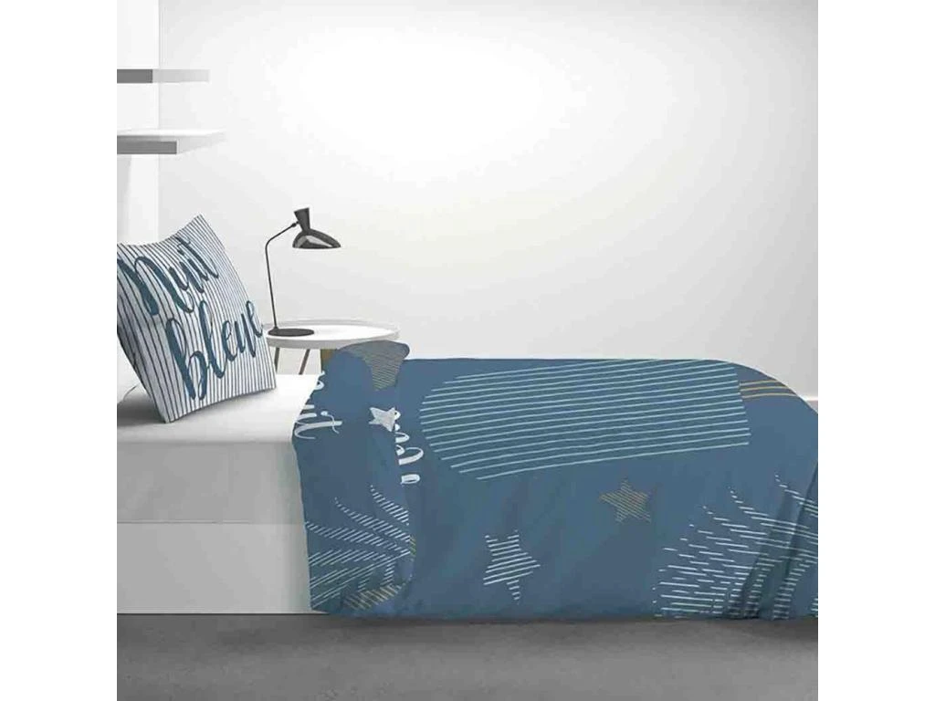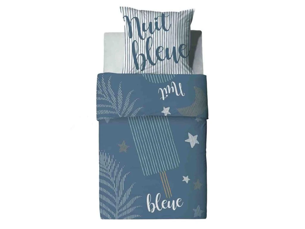 Produit Oeko-Tex® : Le label garantit que les articles ne présentent pas de substances nocives substances pouvant nuire à la santé. Découvrez Nuit Bleue, une parure de lit qui transportera votre enfant vers des nuits étoilées ! Cette parure douce 100% coton au tissage serré lui offrira un grand confort. La housse de couette est proposée en taille 140×200 cm et la taie d’oreiller en 63×63 cm. Facile à installer, la housse de couette se ferme à l’aide de boutons pression et la taie d’oreiller bénéficie de rabats.