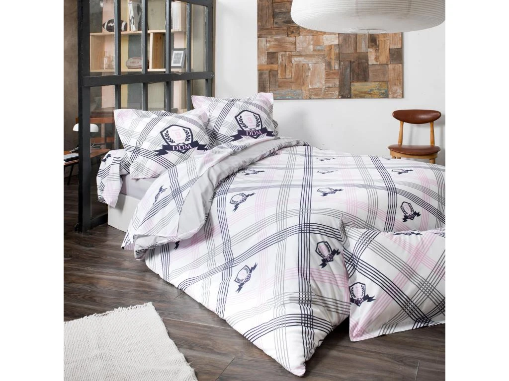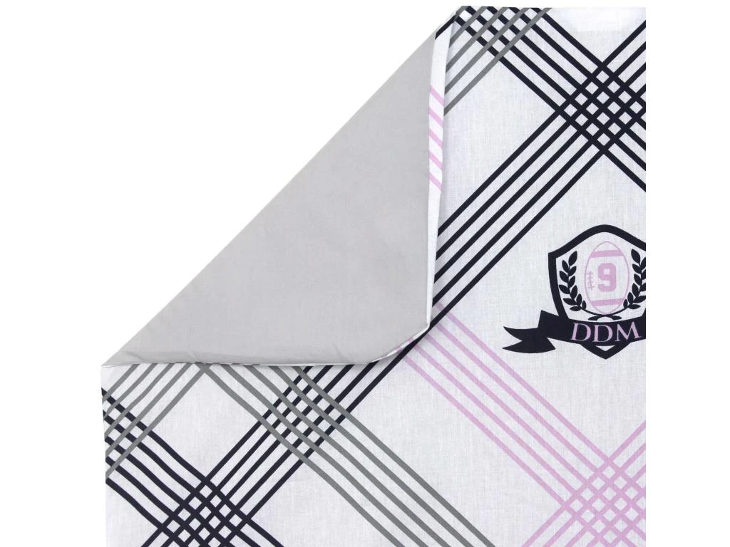 Housse de couette réversible avec des motifs placés, sur une face des rayures dans des tons de marine, gris et rose, parsemés de blasons DDM sur fond blanc et sur l’autre face, un uni de couleur gris galet.