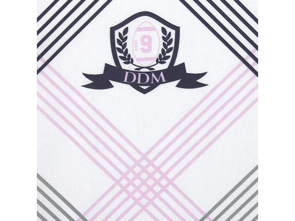 Place au rugby avec la collection Demi de Mêlée Jubilé imprimée de rayures et de blasons déclinés dans des tons de rose, gris et marine sur fond blanc.
