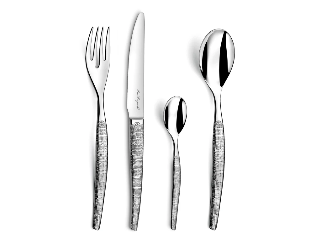 Ensemble de 24 couverts Laguiole de la gamme Jet Textil. Couverts en acier 18/0 avec finition brillante et une gravure textile.