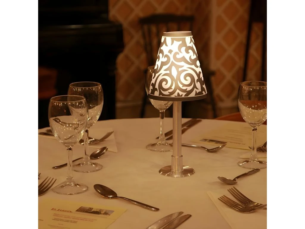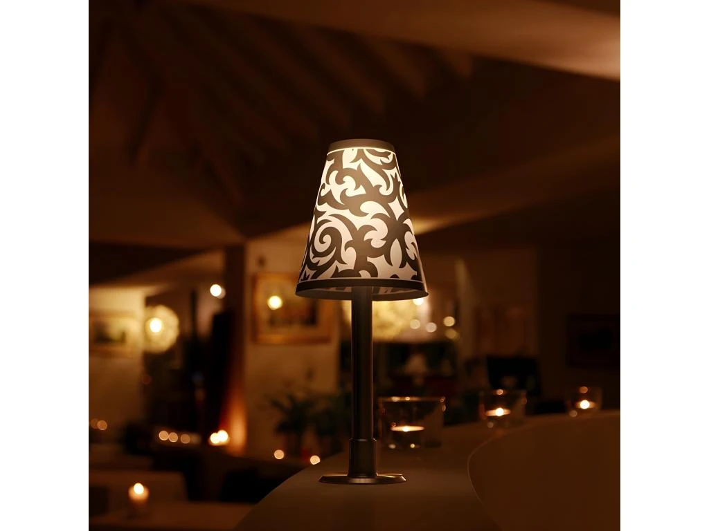 Une idée très originale pour éclairer vos tables de fêtes ou d’amoureux en intérieur et extérieur. Lampe à poser avec 3 abat-jours au choix qui s’allume en tournant le capuchon. Fonctionne avec 3 piles AA non incluses (pour 100 à 120 heures d’utilisation) Durée de vie : 10000 heures Lumière chaude 3000K lumens Matière : aluminium, acrylique haute qualité Dimensions : 27 x diam 11.5cm