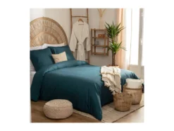 Parure De Lit 2 Personnes En Coton Et Lin Bleu Canard 240 X 220 Cm Housse De Couette Avec 2 Taies
