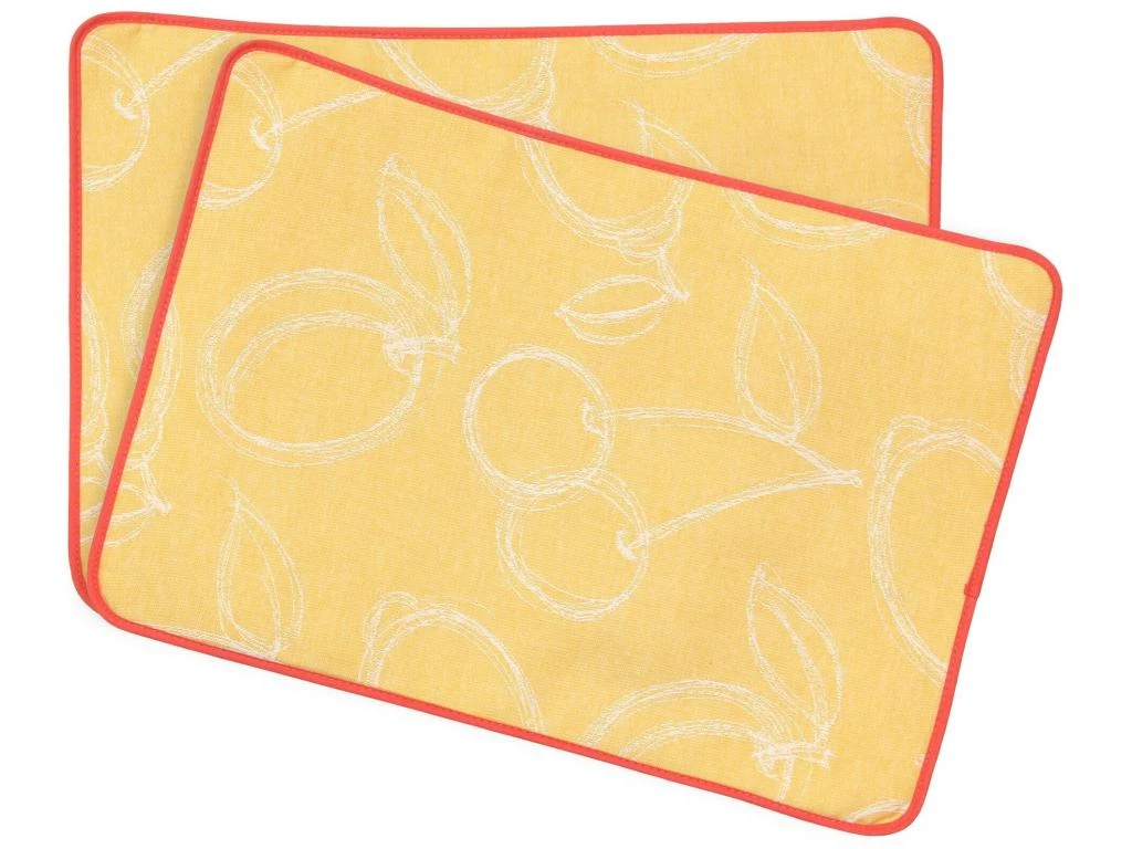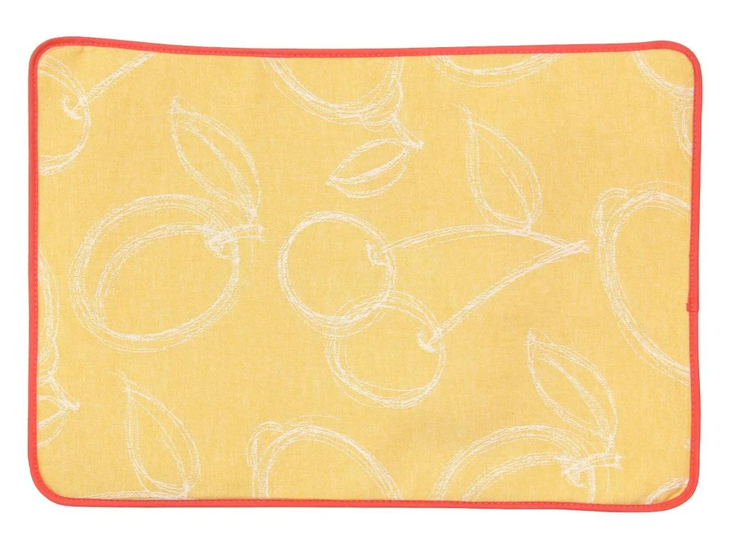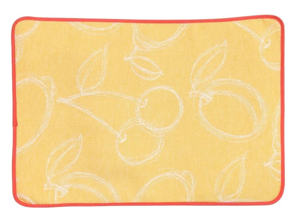 Vous apprécierez les motifs de fruits sur fond orange avec une délicate finition biais.
