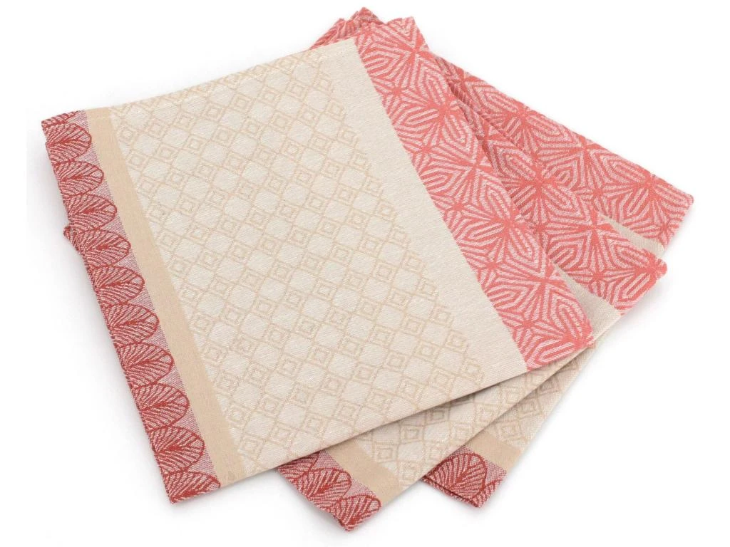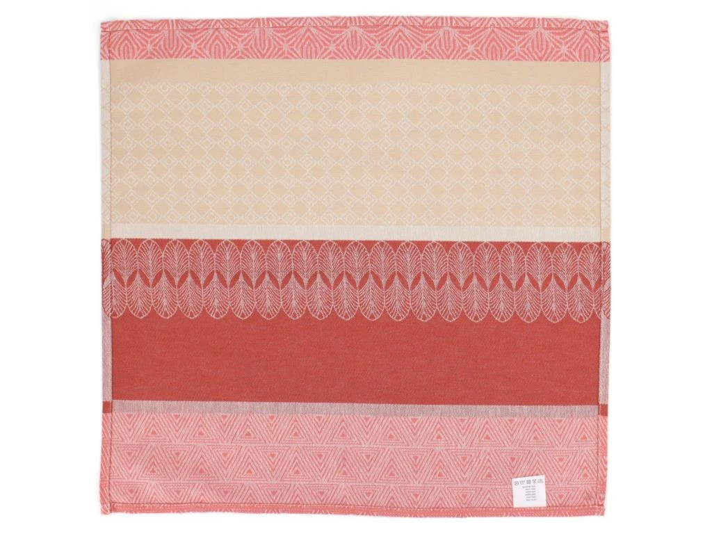 Serviette de table sobre et élégante en Jacquard 100% coton avec ces petits motifs géométriques et feuilles dans des tons de rouge corail et de beige lin. Serviette de table très chic qui habillera votre table avec beaucoup d’élégance.