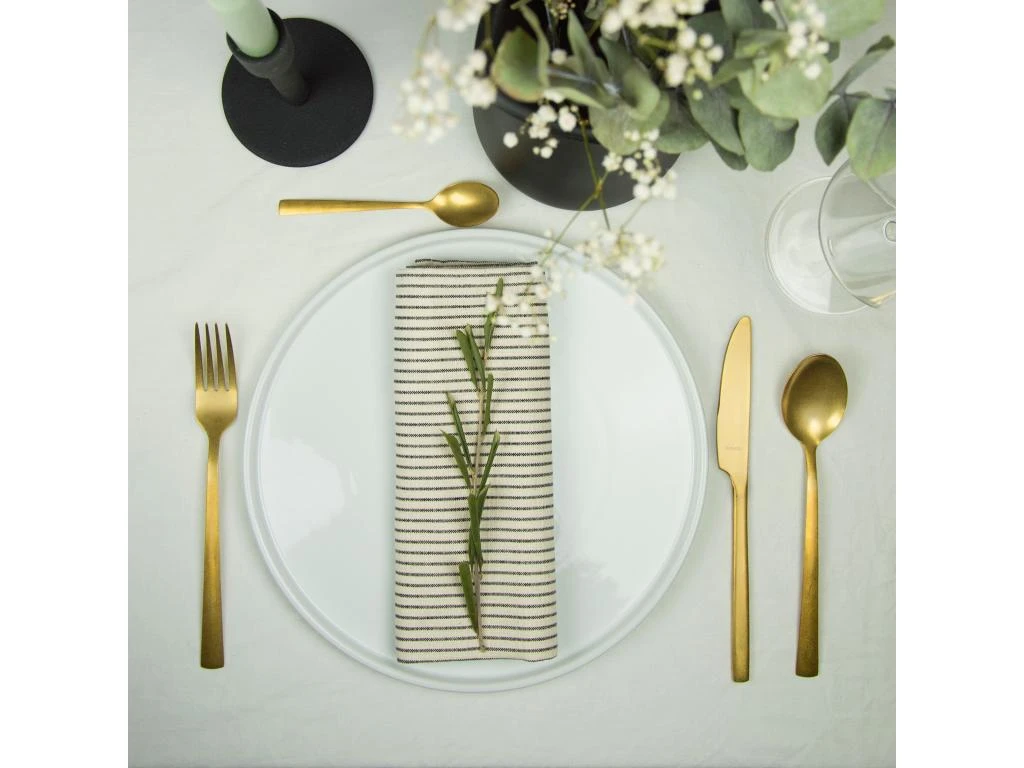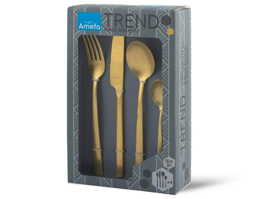 Ensemble de 16 couverts pour 4 personnes de la gamme Manille Doré livré en coffret. Acier inox avec finition vintage et revêtement doré mat.