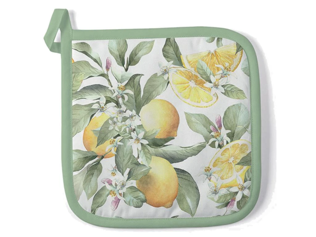 Manique de cuisine citrons Tissu extérieur : 100 % coton Garnissage : 100 % polyester Doublure : 100 % polypropylène Dimensions : 20 x 20 cm A l’unité