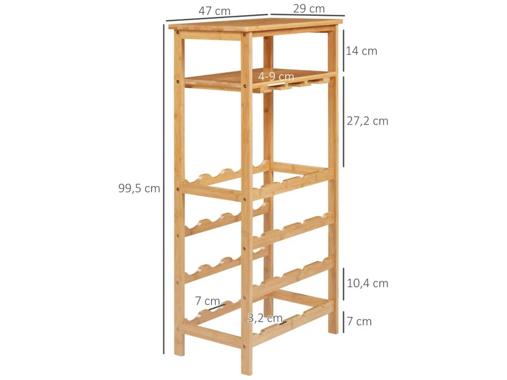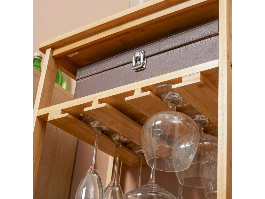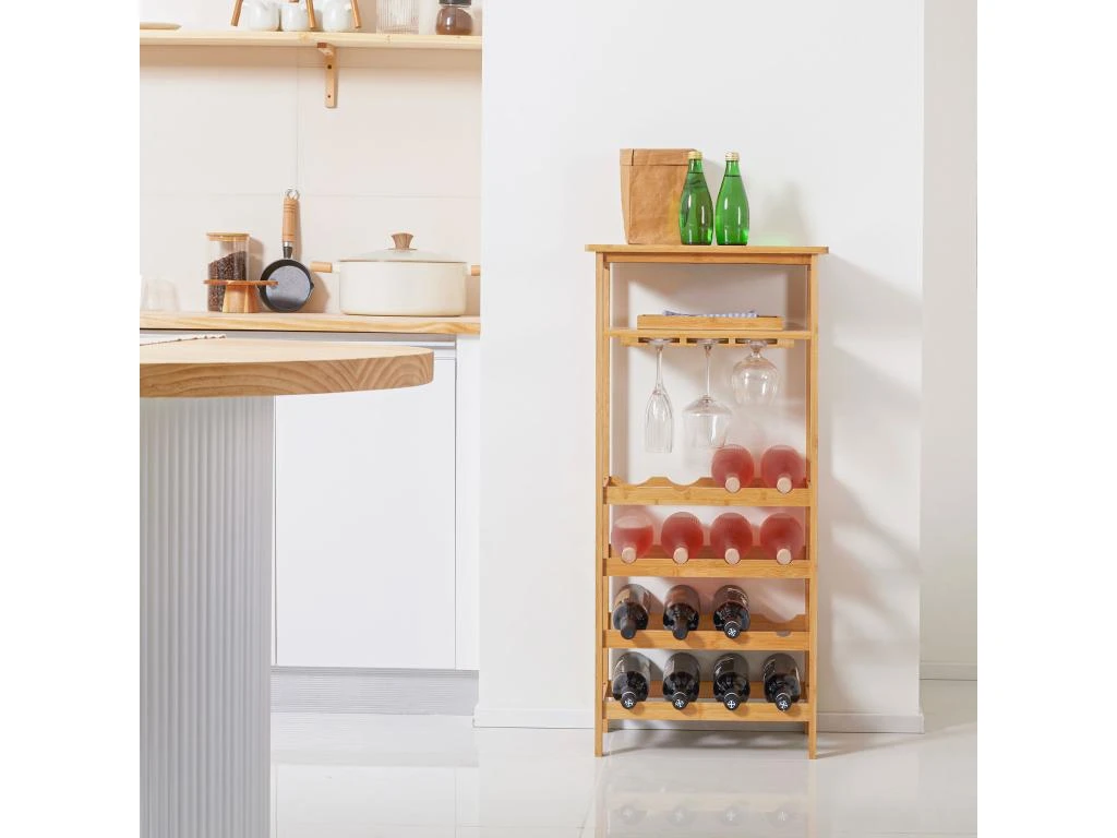 – Grande capacité de stockage : 4 bouteilles maximum par niveaux soit capacité totale de 16 bouteilles stockées – 3 rangées pour ranger des verres (capacité 9 verres à pied) et 2 étagères pour les accessoires