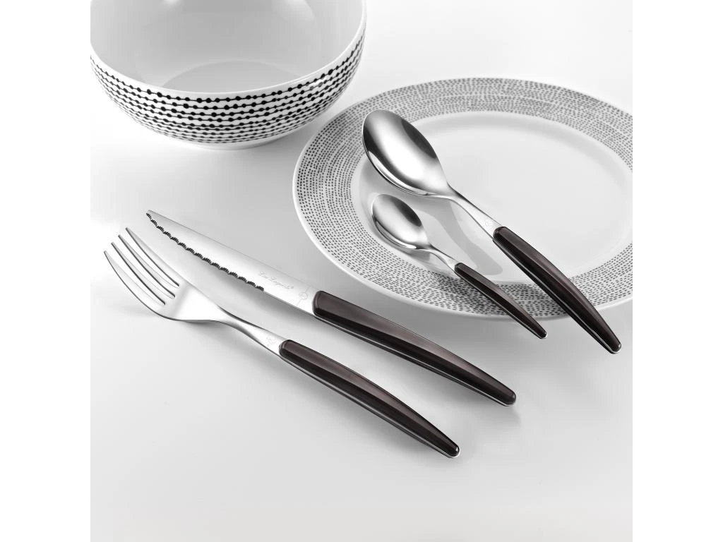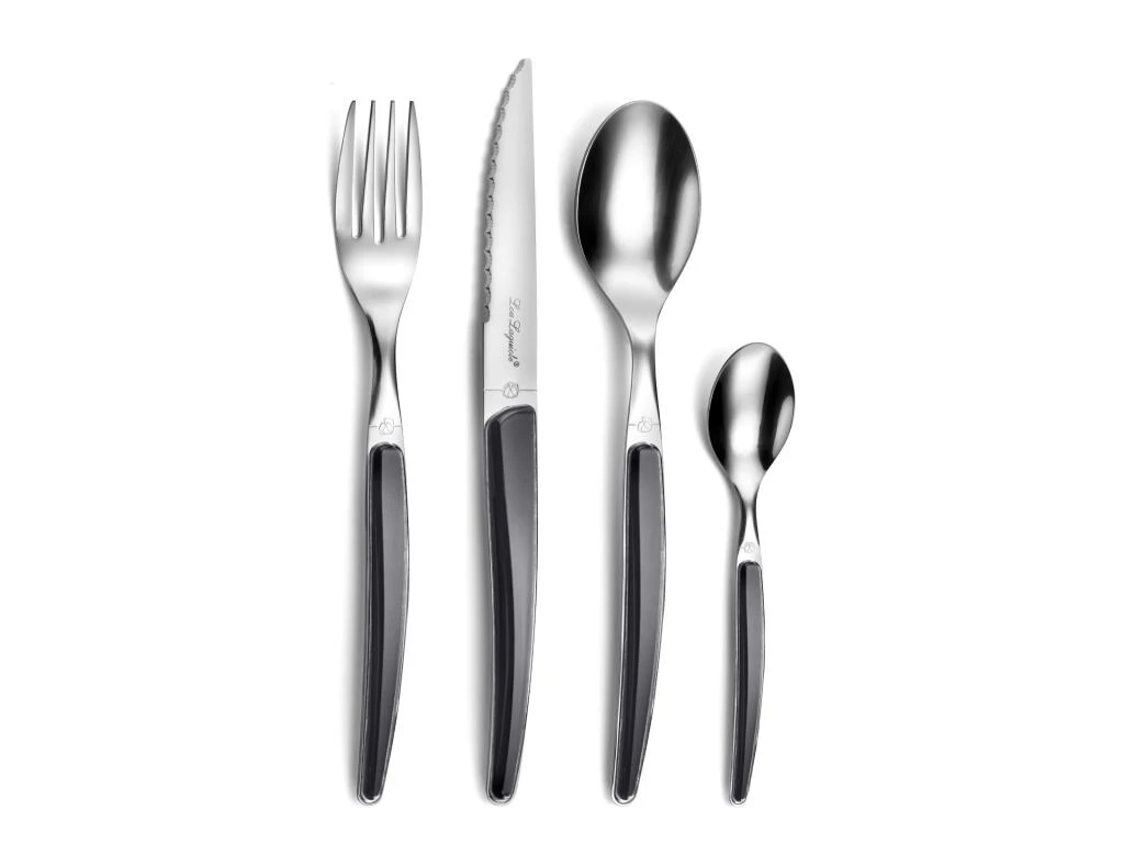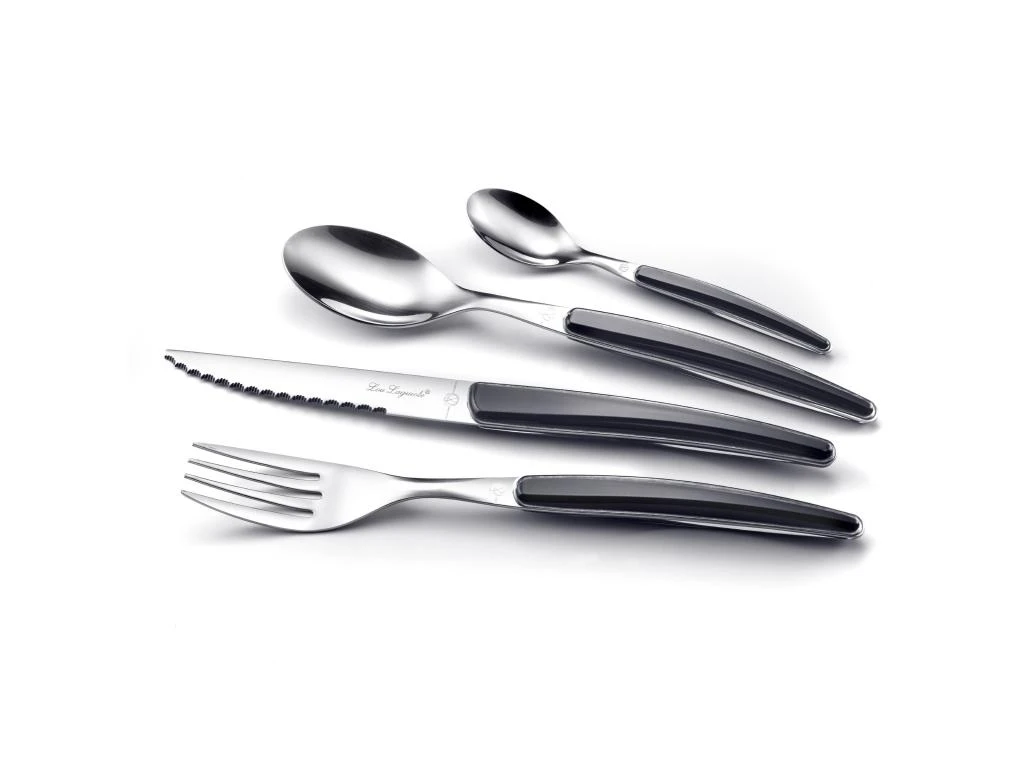 Ensemble de 24 couverts Lou Laguiole pour 6 personnes de la gamme Montana. Manche cristallin de couleur noire. Lame inox microdentée en acier inoxydable, finition polie brillante.
