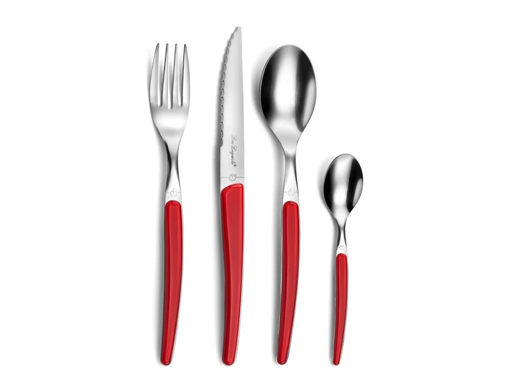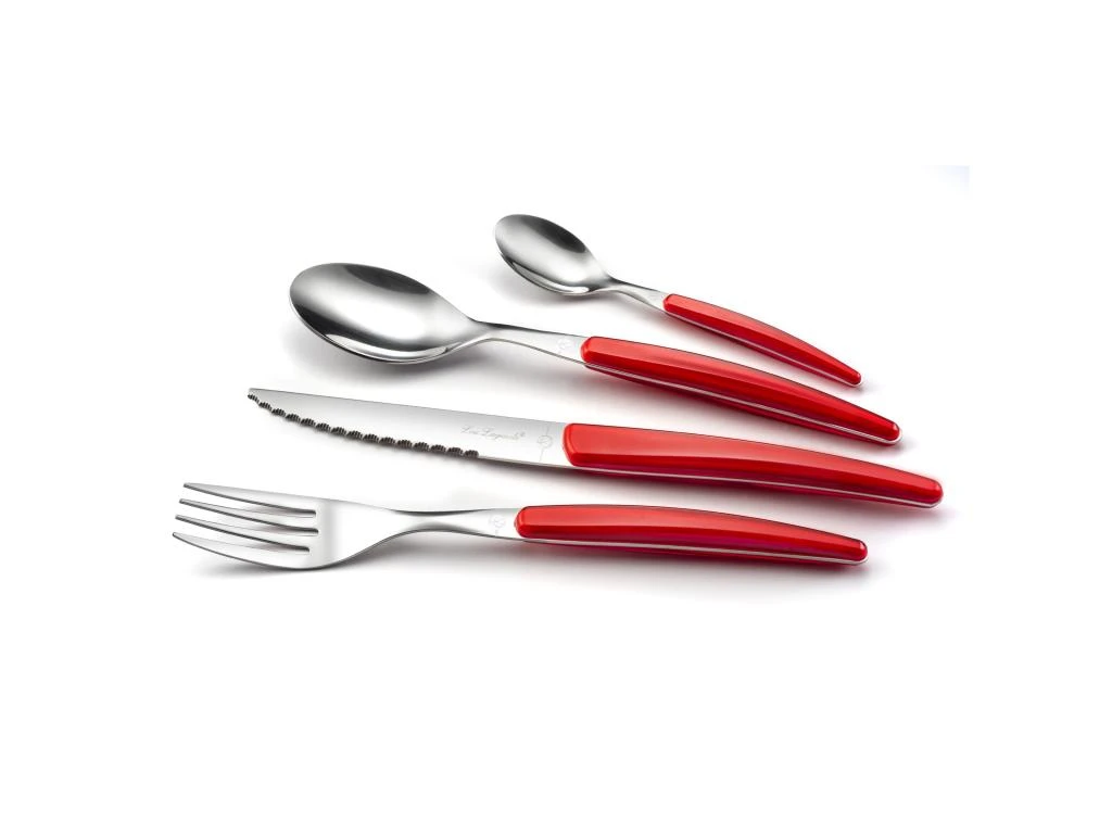Ensemble de 24 couverts Lou Laguiole pour 6 personnes de la gamme Montana. Manche cristallin de couleur rouge. Lame inox microdentée en acier inoxydable, finition polie brillante.