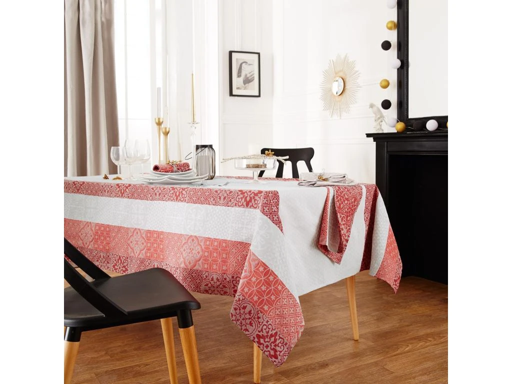 Nappe colorée et élégante en Jacquard 100% coton avec des motifs mosaïques et rayures déclinés dans des tons de rouge et de lin. Nappe très chic qui habillera votre table avec beaucoup d’élégance.