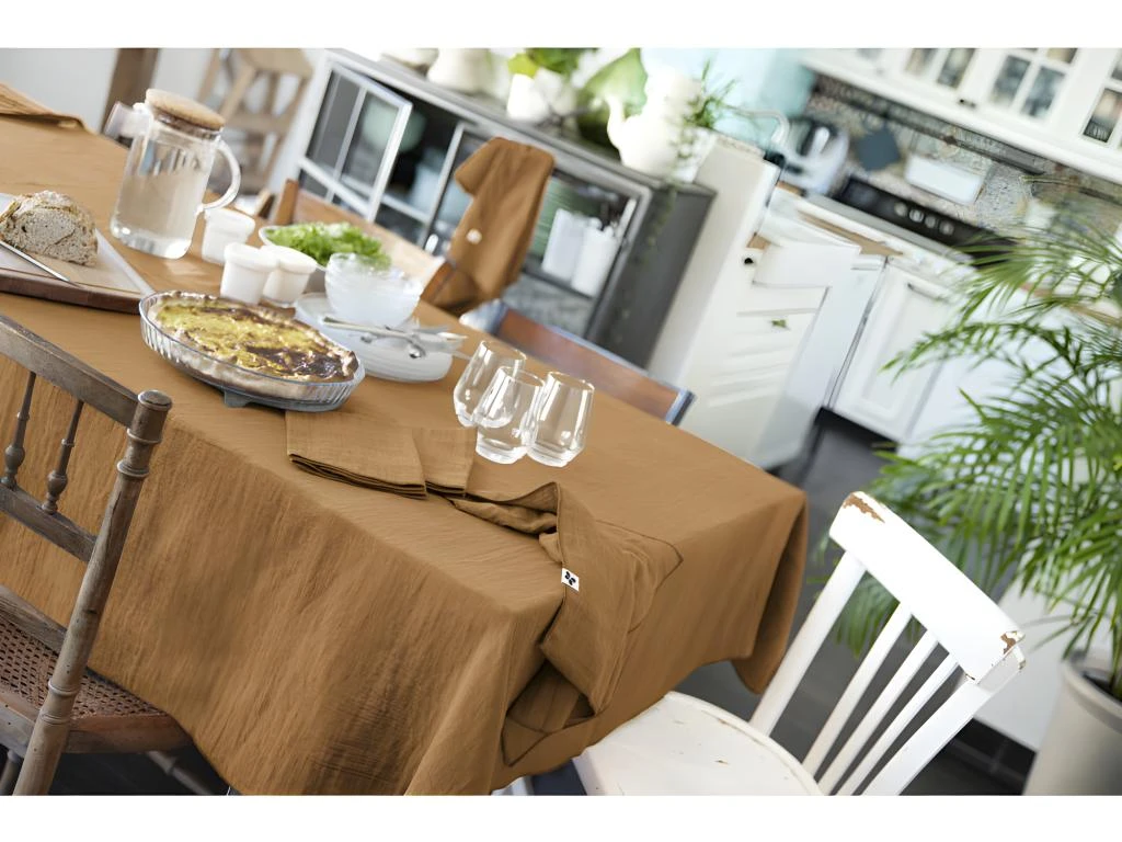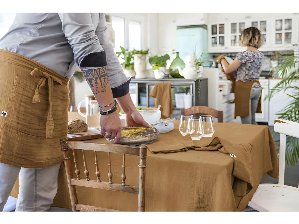 Et comme le plaisir de manger et de recevoir est un art de vivre, la star de la table c’est bien cette nappe tendance et bohème en gaze de coton, une matière légère, fluide et surtout très douce.