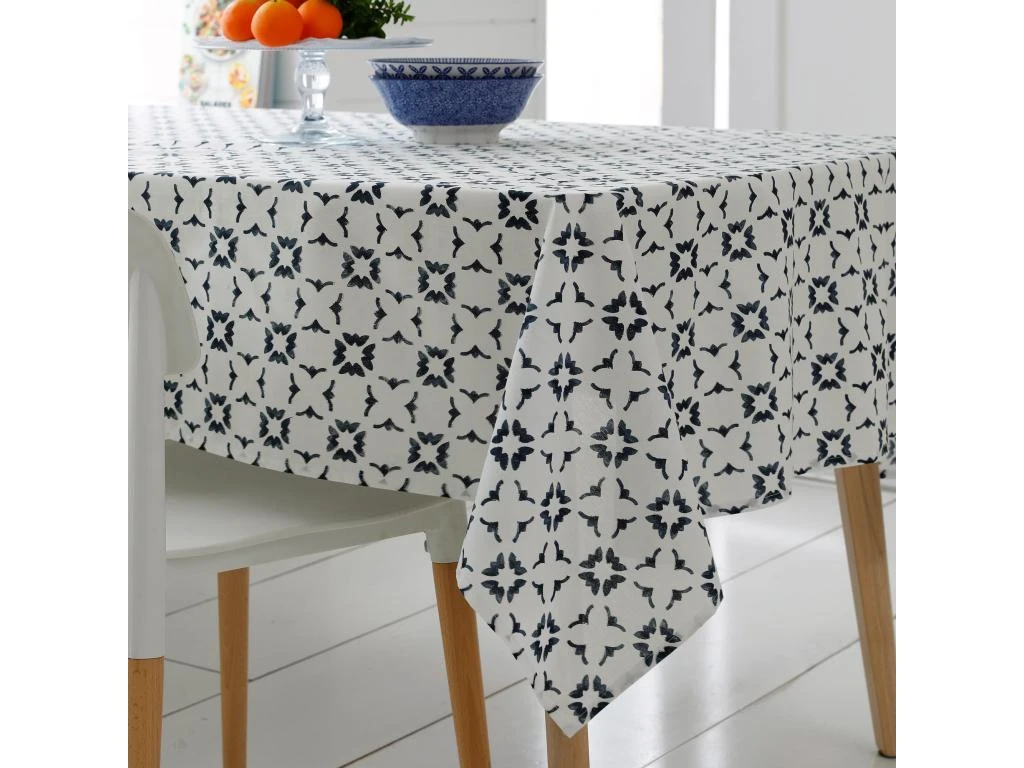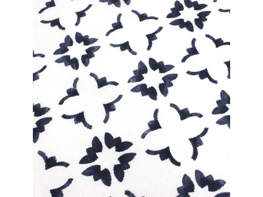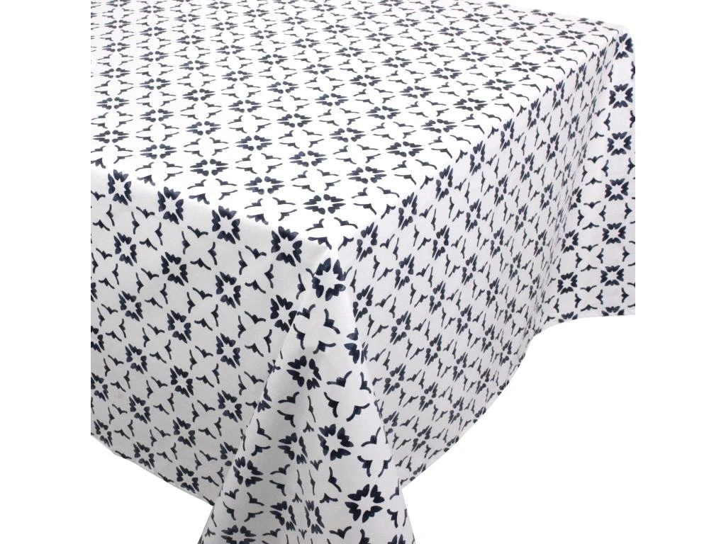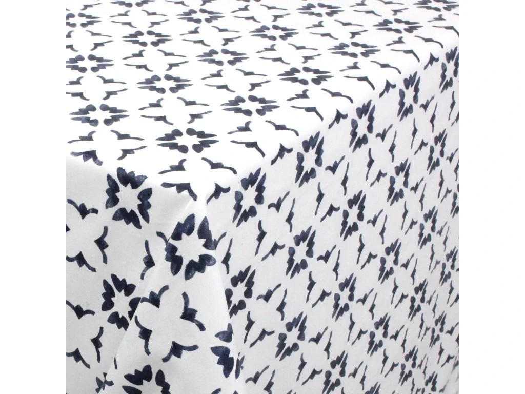 Nappe avec enduction acrylique colorée et élégante 100% coton enduite avec des imprimés motifs batiks dans un bleu profond sur fond blanc pour une ambiance harmonieuse et contemporaine.