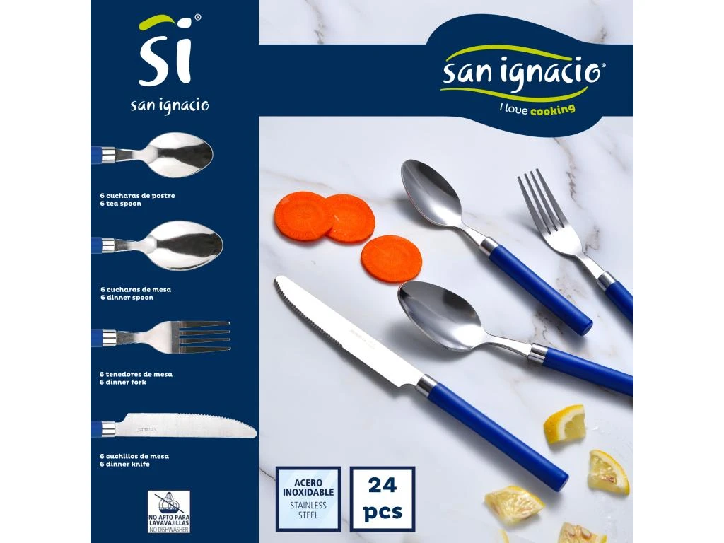 Couverts de 24 pièces en acier inoxydable, avec des manches en plastique en bleu.