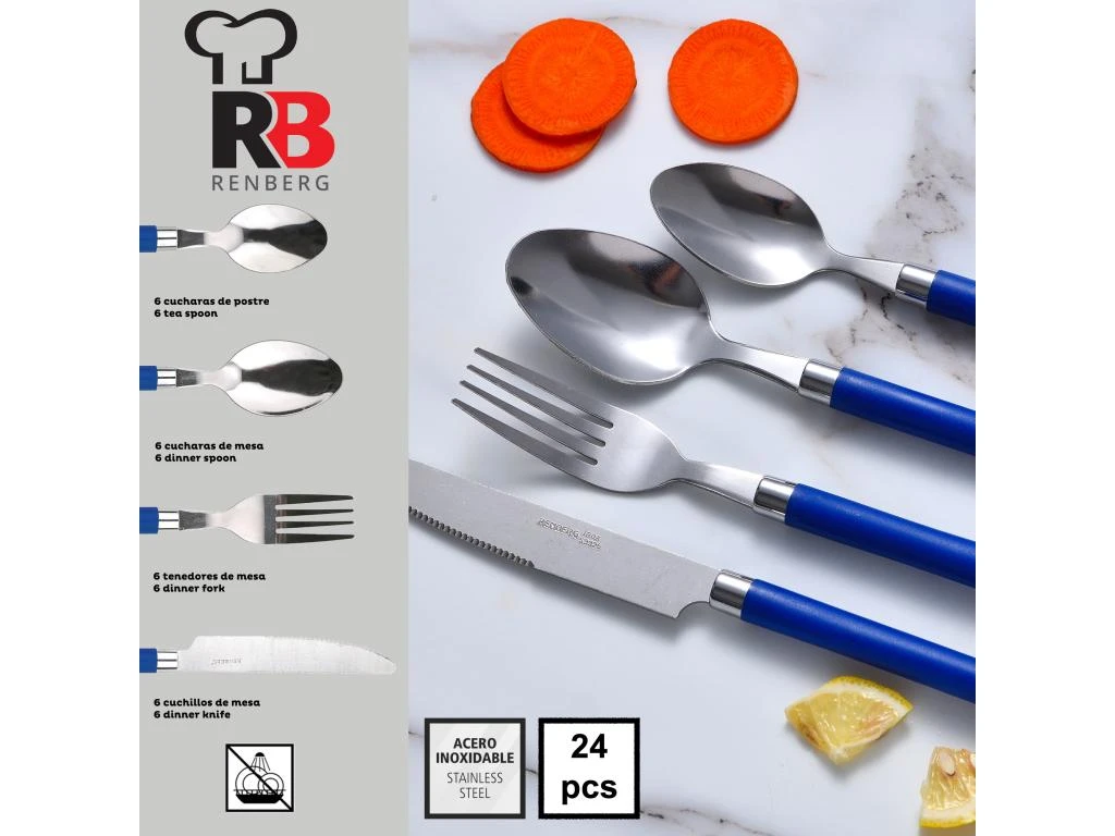 24 pièces, acier inoxydable, avec poignées en plastique bleu.