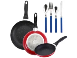 24 pièces, acier inoxydable, avec poignées en plastique bleu.