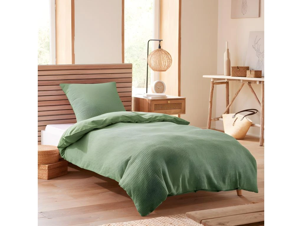 En coton nid d’abeille, une matière légère, fluide et qui donne du relief et de la douceur à votre chambre.