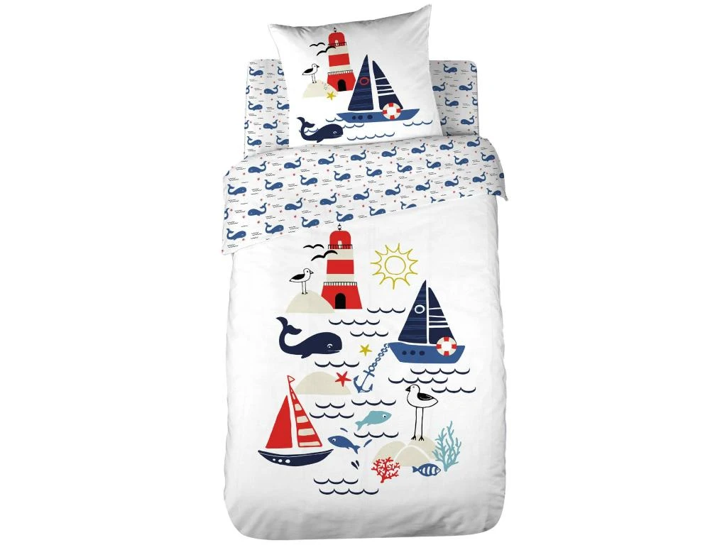 Ambiance maritime avec cette parure de lit imprimée de baleines, voiliers et phare dans des tons de bleu et rouge sur fond blanc. La collection linge de lit MATELOT BLEU en coton bio est idéale pour une décoration de chambre d’enfants révant de découverte des océans.