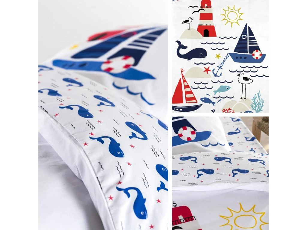 Housse de couette reversible avec une face imprimée de baleines, voiliers et phare dans des tons de bleu et rouge sur fond blanc, sur l’autre face allover de petites baleines et étoiles de mers sur fond blanc. Finition sans rabat aux pieds, fermeture par boutons, et passe-mains pour enfiler la couette facilement.