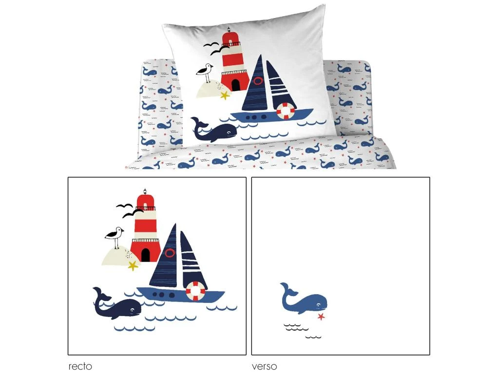 Taie d’oreiller carrée avec deux faces imprimées différentes, avec une face imprimée d’un grand voilier, une baleine avec un phare en arrière plan, sur l’autre face petite baleine sur fond blanc. Finition simple, forme portefeuille avec un rabat intérieur.