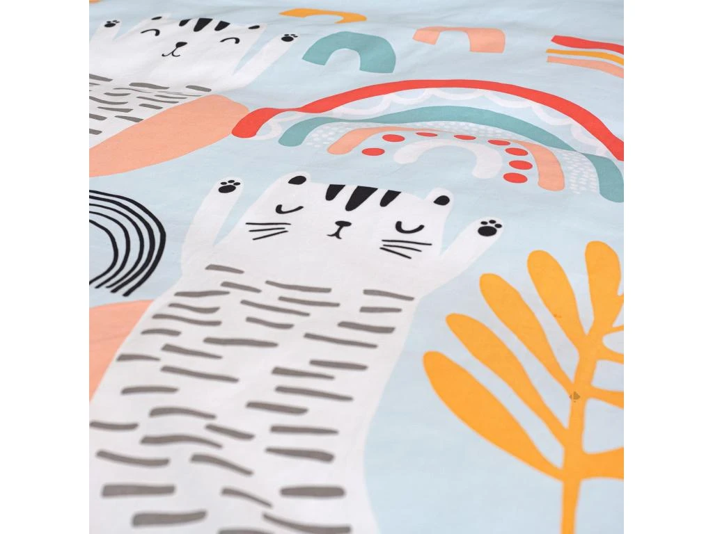 Housse de couette reversible avec une face imprimée d’arc-en-ciel, de grand chat blanc et motif abstrait sur fond bleu pâle, sur l’autre face allover de petits motifs coordonnés sur fond blnc. Finition simple, sans rabat aux pieds, fermeture par boutons, et passe-mains pour enfiler la couette facilement.
