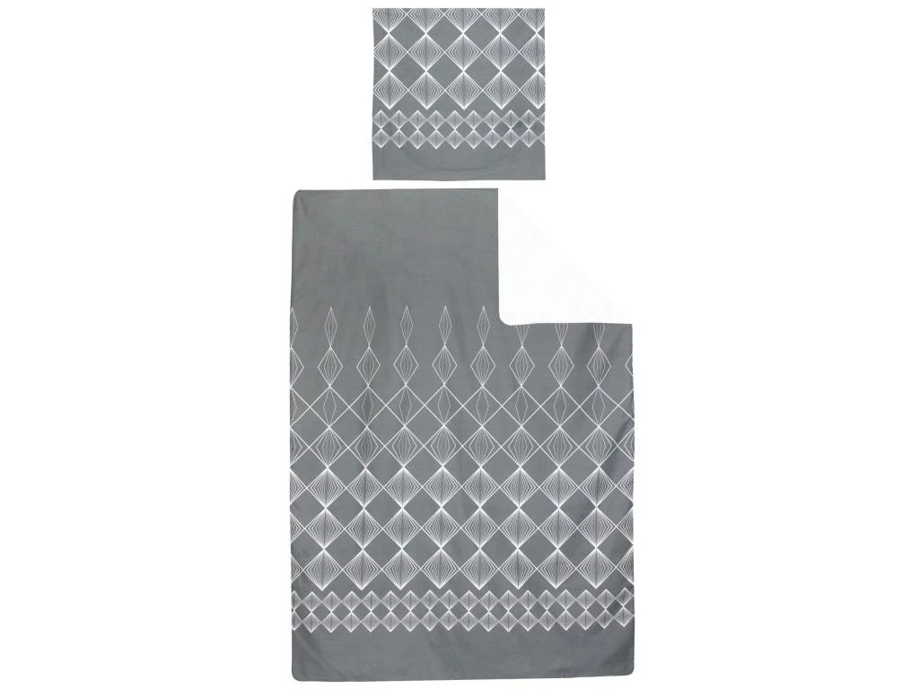 Housse de couette avec une face composée d’une multitude de losanges blanc sur fond gris foncé, et sur l’autre face un uni de couleur blanc.