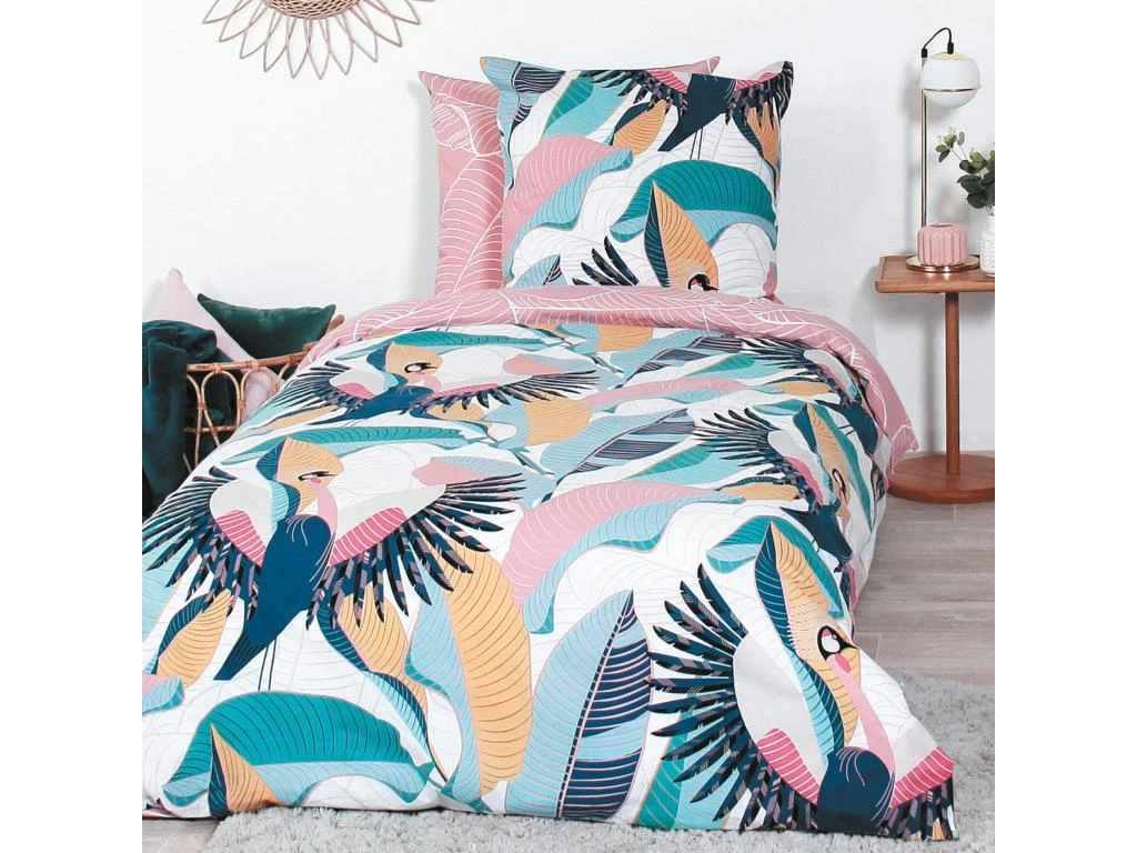 Housse de couette reversible avec une face imprimée de grues sur un fond de végétation jungle coloris pastels de rose, bleu et jaune sur fond blanc, sur l’autre face feuilles tropicales en filaire blanc sur fond rose pastel. Finition sans rabat aux pieds, fermeture par boutons, et passe-mains pour enfiler la couette facilement.