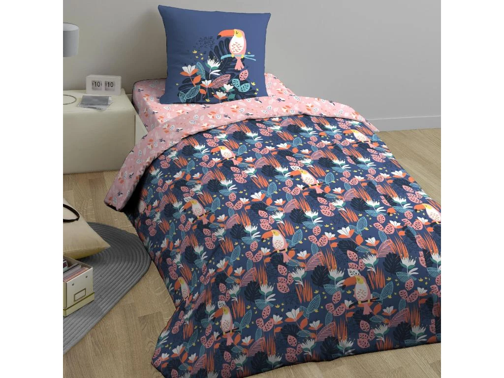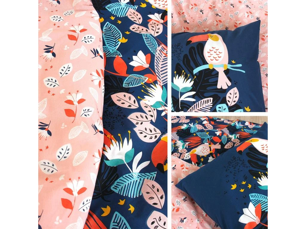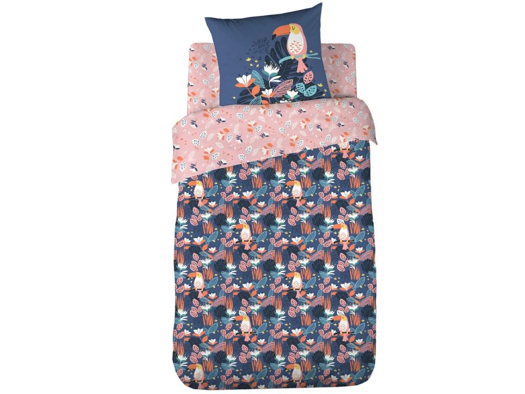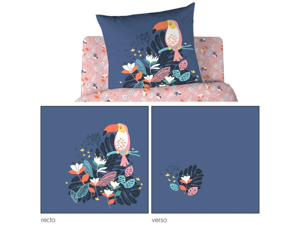 Housse de couette reversible avec une face imprimée de toucans, fleurs et feuilles dans des tons de blanc, jaune, rose et orange sur fond bleu nuit, sur l’autre face petites fleurs et feuilles sur fond rose. Finition avec rabat de maintien aux pieds forme cheminée, et passe-mains pour enfiler la couette facilement.
