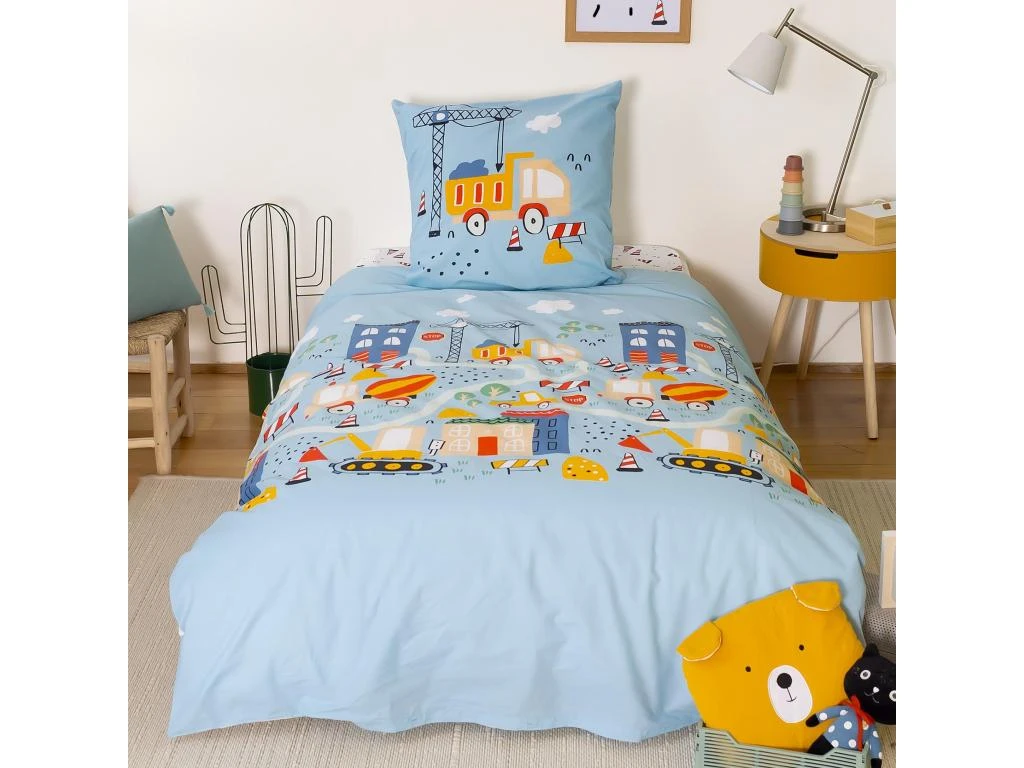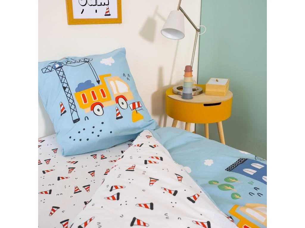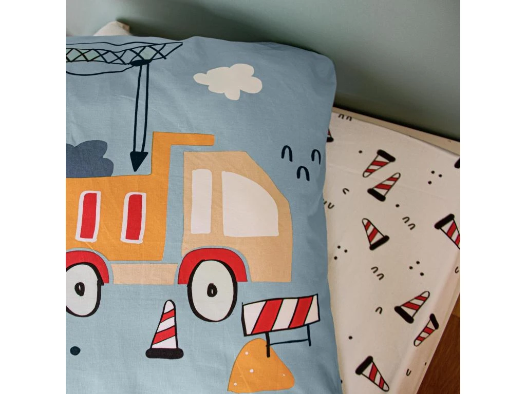 Housse de couette reversible avec une face imprimĂ©e d’engins de chantiers, pelleteuses, camions et grues en plein travaux des des tons de bleu, orange et rouge sur fond bleu clair, sur l’autre face petits cĂ´nes de chantiers sur fond blanc. Finition simple, sans rabat aux pieds, fermeture par boutons, et passe-mains pour enfiler la couette facilement.