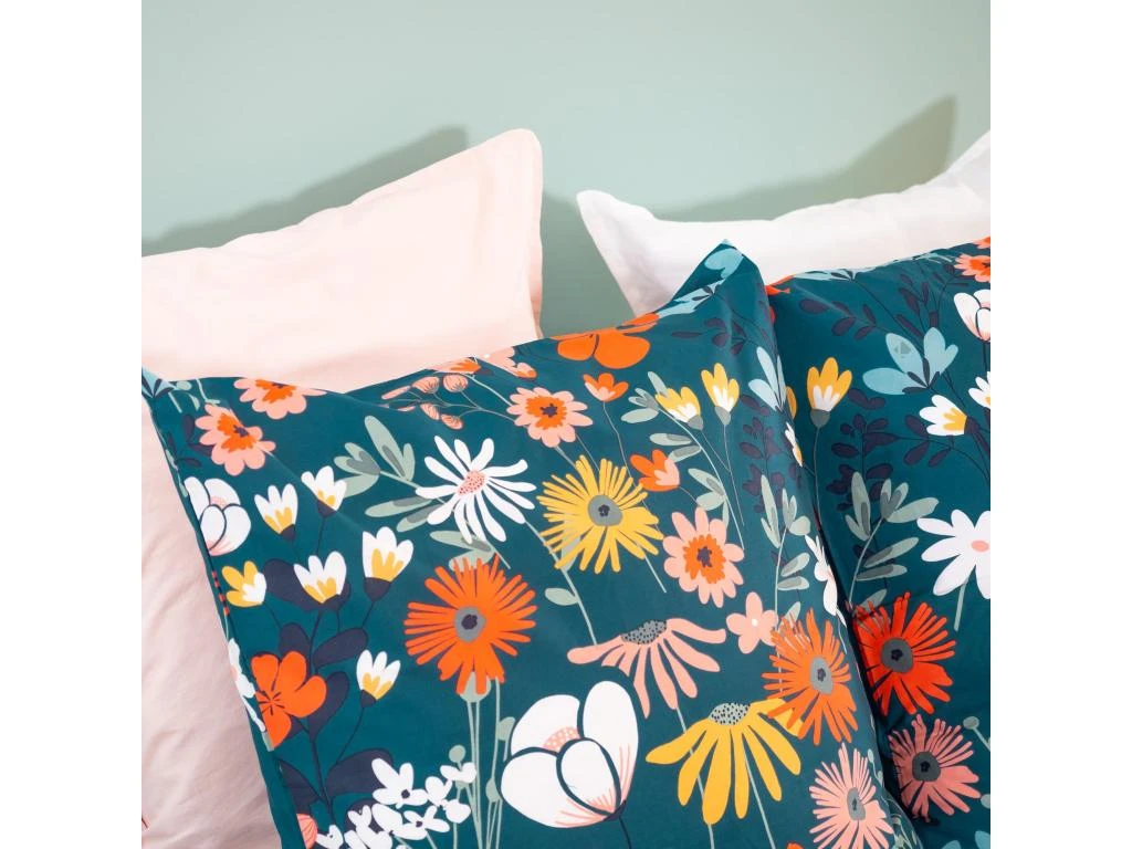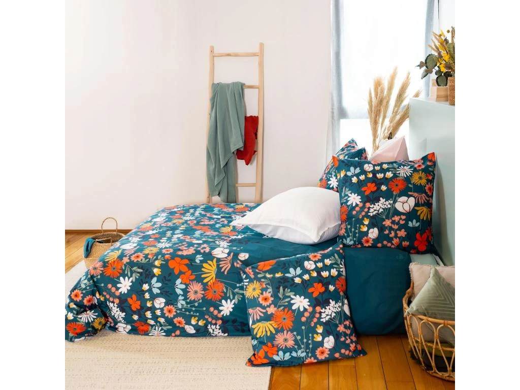 Housse de couette avec un imprimée de fleurs et bourdeons en partie basse dans des tons de jaune, blanc, rose et orange sur fond bleu. Finition sans rabat aux pieds, fermeture par boutons, et passe-mains pour enfiler la couette facilement.