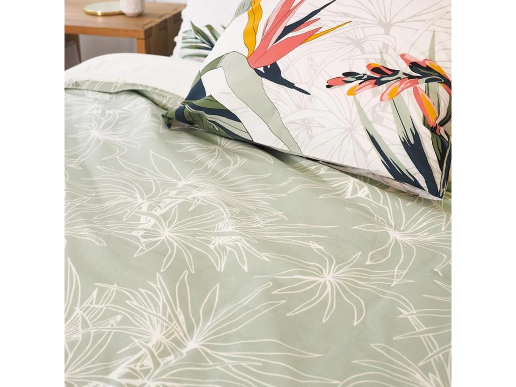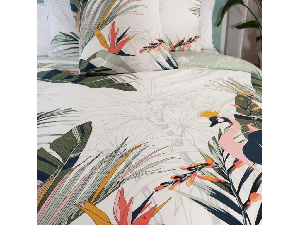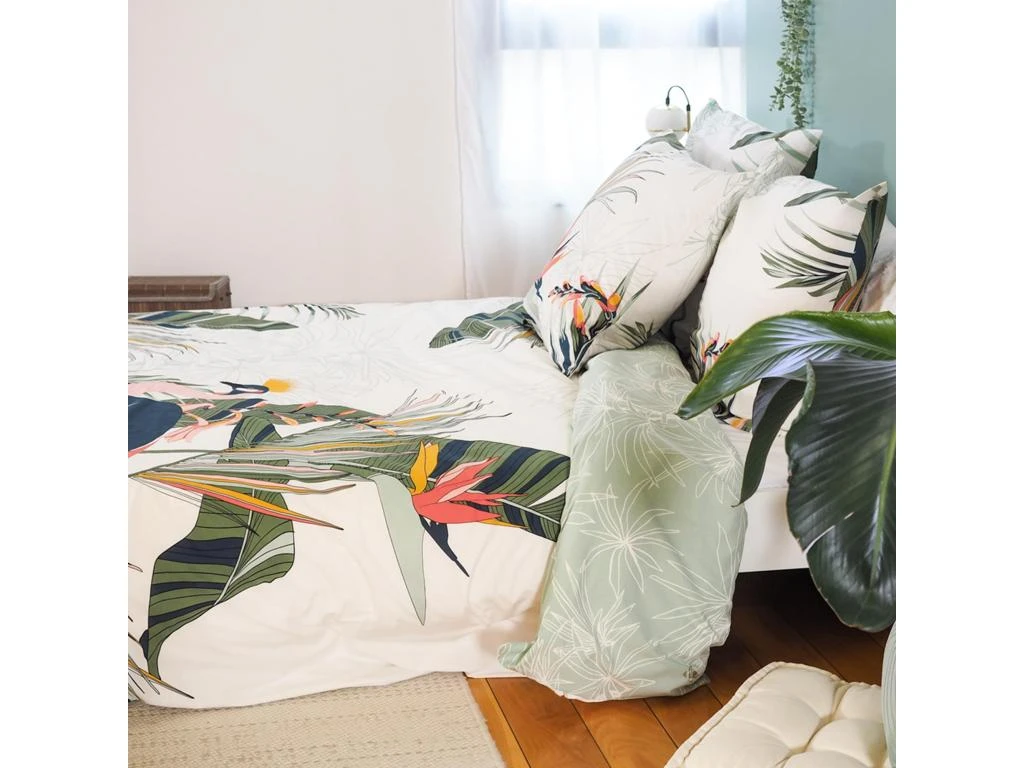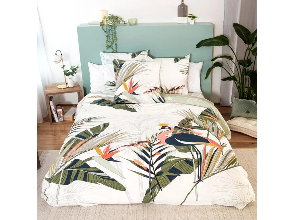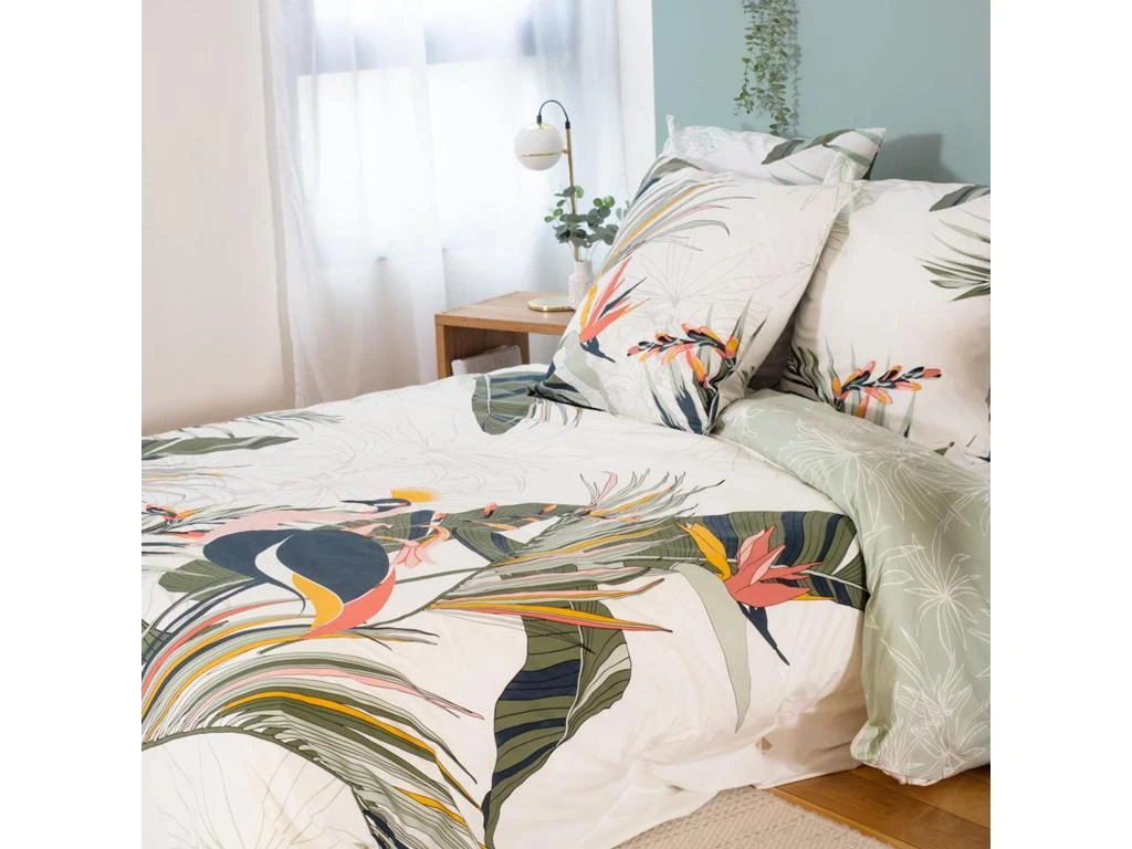 Ambiance végétale avec cette parure de lit 2 personnes réversible avec un imprimée de feuilles, oiseaux et fleurs en partie colorés et en partie en filaire sur fond blanc.