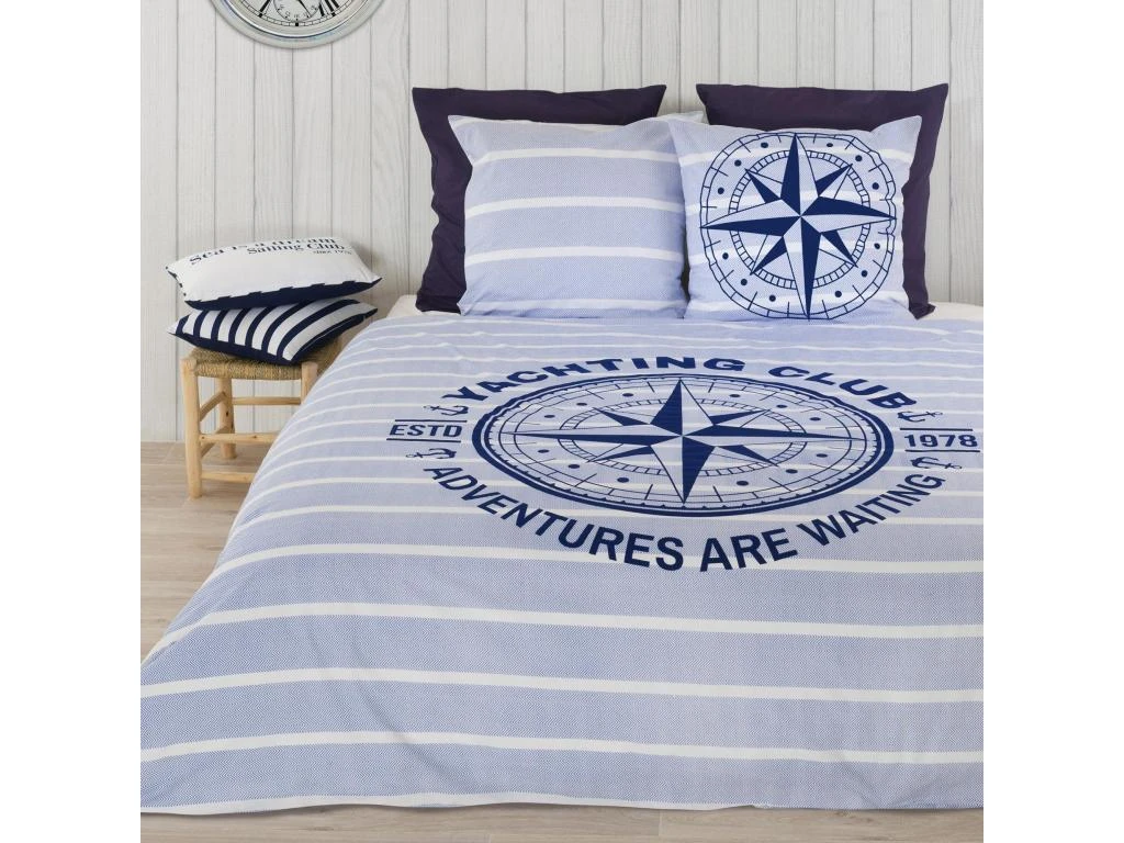 Housse de couette reversible avec une face imprimĂ©e d’une grande rose des vents et la mention « yatching club – adventures are waiting » au centre dans des tons de bleu sur fond rayĂ© bleu et blanc, sur l’autre face fond uni bleu. Finition sans rabat aux pieds, fermeture par boutons, et passe-mains pour enfiler la couette facilement.
