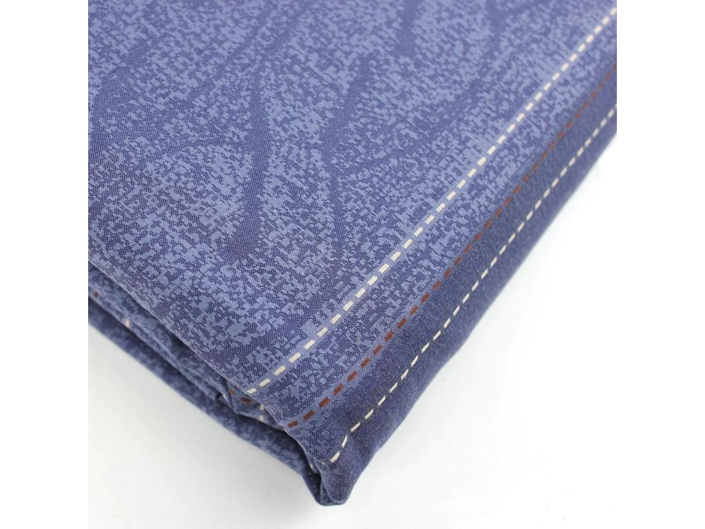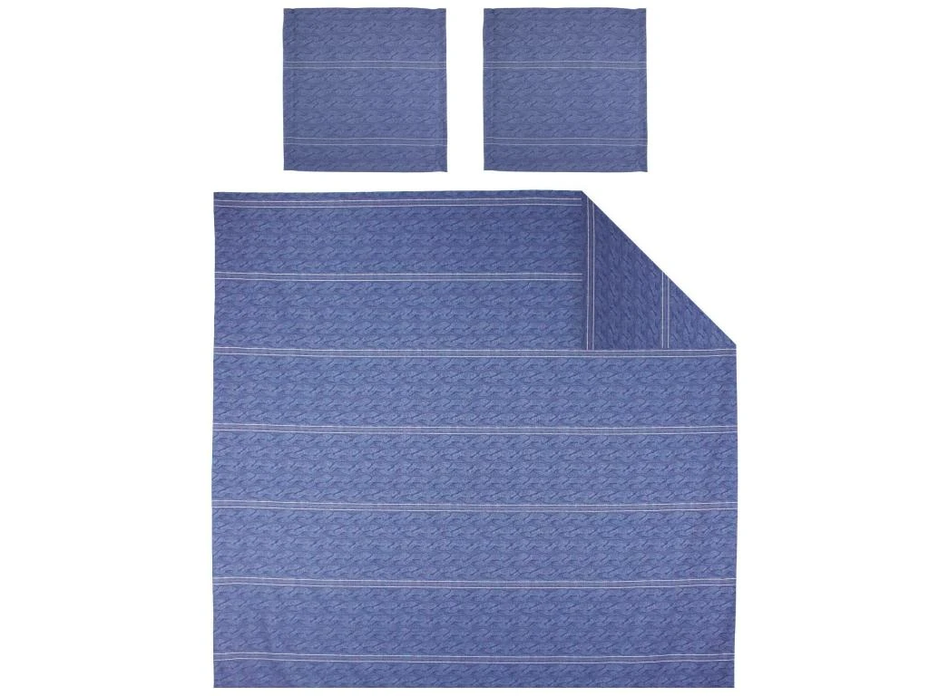 Housse de couette 260×240 cm en satin jacquard avec motifs mailles bleues et coutures blanches.