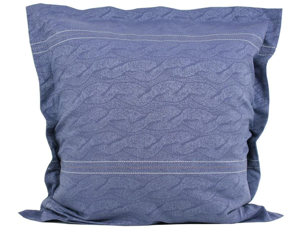 Taie d’oreiller 65×65 cm en satin jacquard avec motifs mailles bleues et coutures blanches.