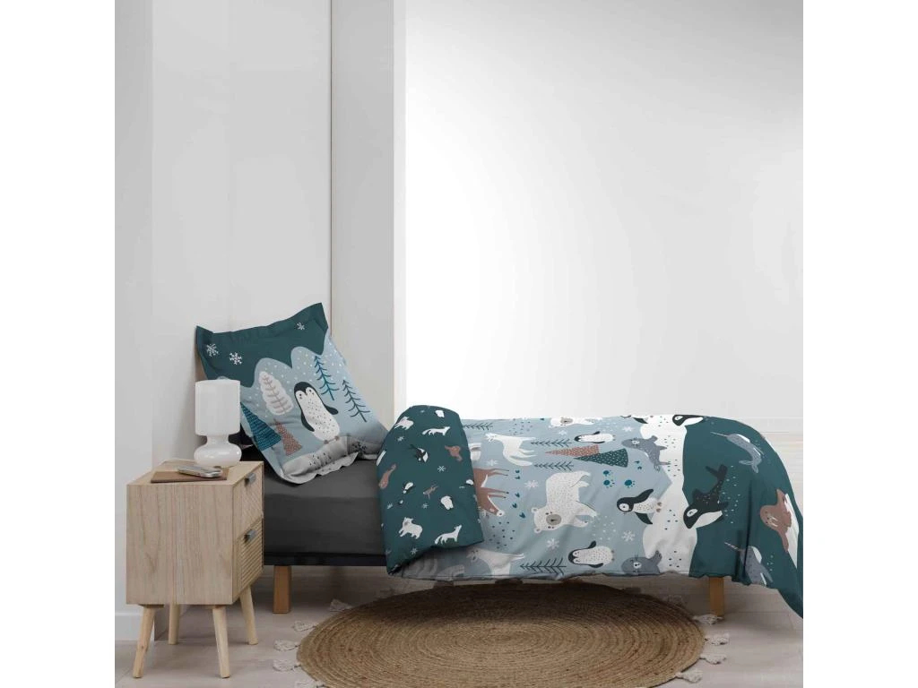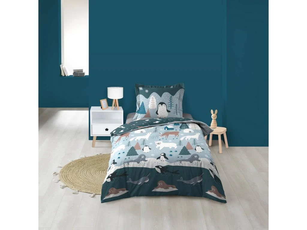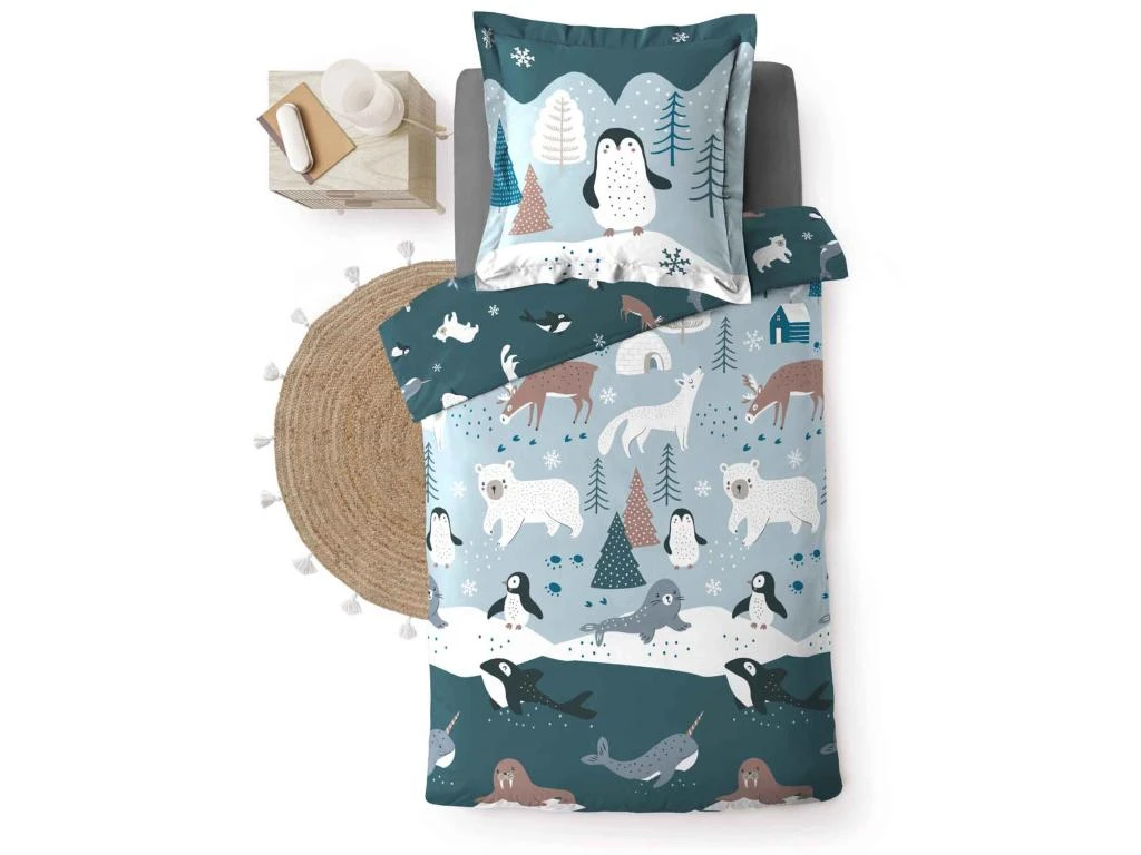 Cette parure de lit enfant bleue est imprimée d’un dessin avec des petits animaux de la banquise et leurs adorables traces de pas. Elle fera voyager votre enfant tout au long de la nuit. En plus d’être jolie, cette parure de lit est ludique et éducative.