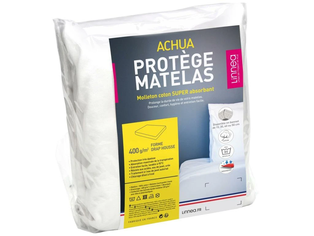 Le protège-matelas ACHUA est composé d’un molleton gratté 2 faces de 400g/m2 vous garantissant un excellent confort, et une absorption maximale de la transpiration afin de protéger votre matelas.