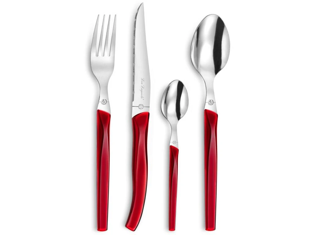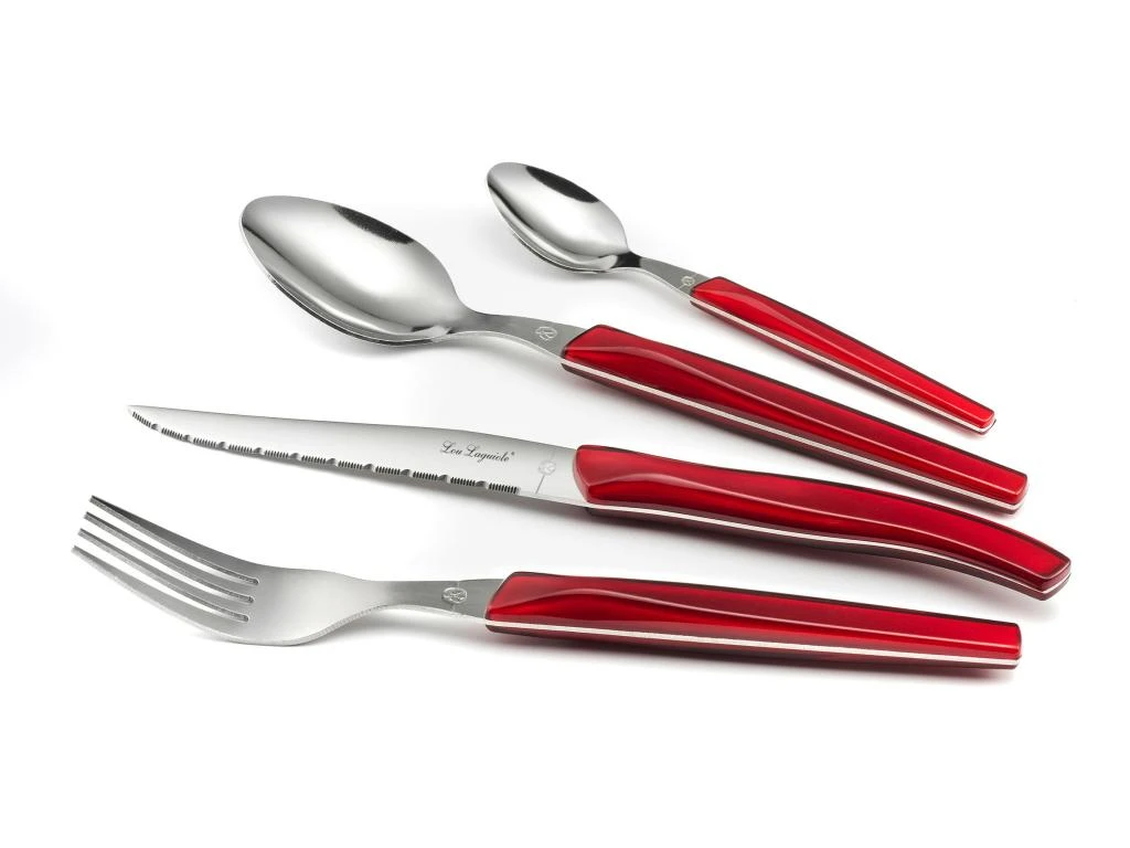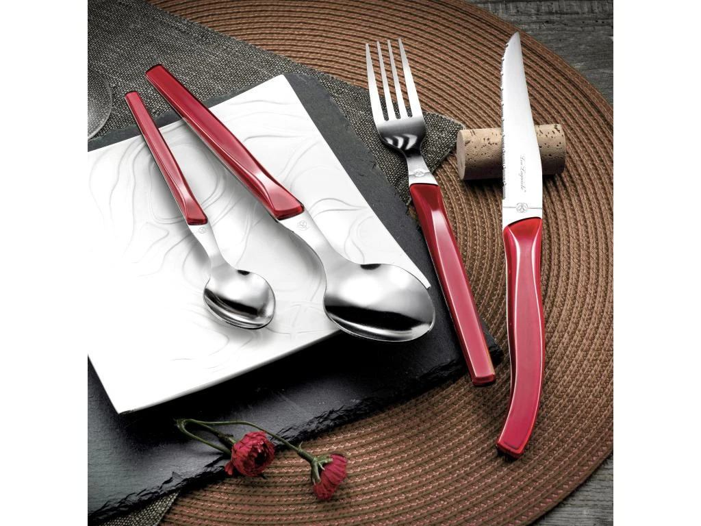 Ensemble de 24 couverts Laguiole pour 6 personnes de la gamme Rising Sun, livré en boite kraft. Manche lumineux en bi-injection, couleur rouge. Lame inox microdentée en acier inoxydable et tranchant longue durée.